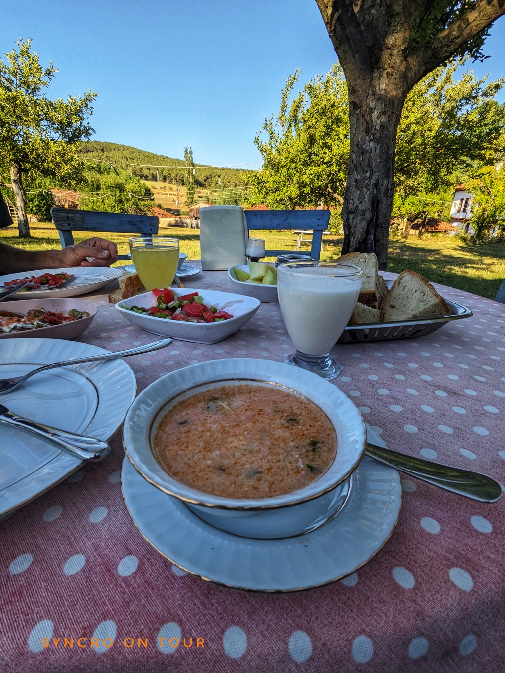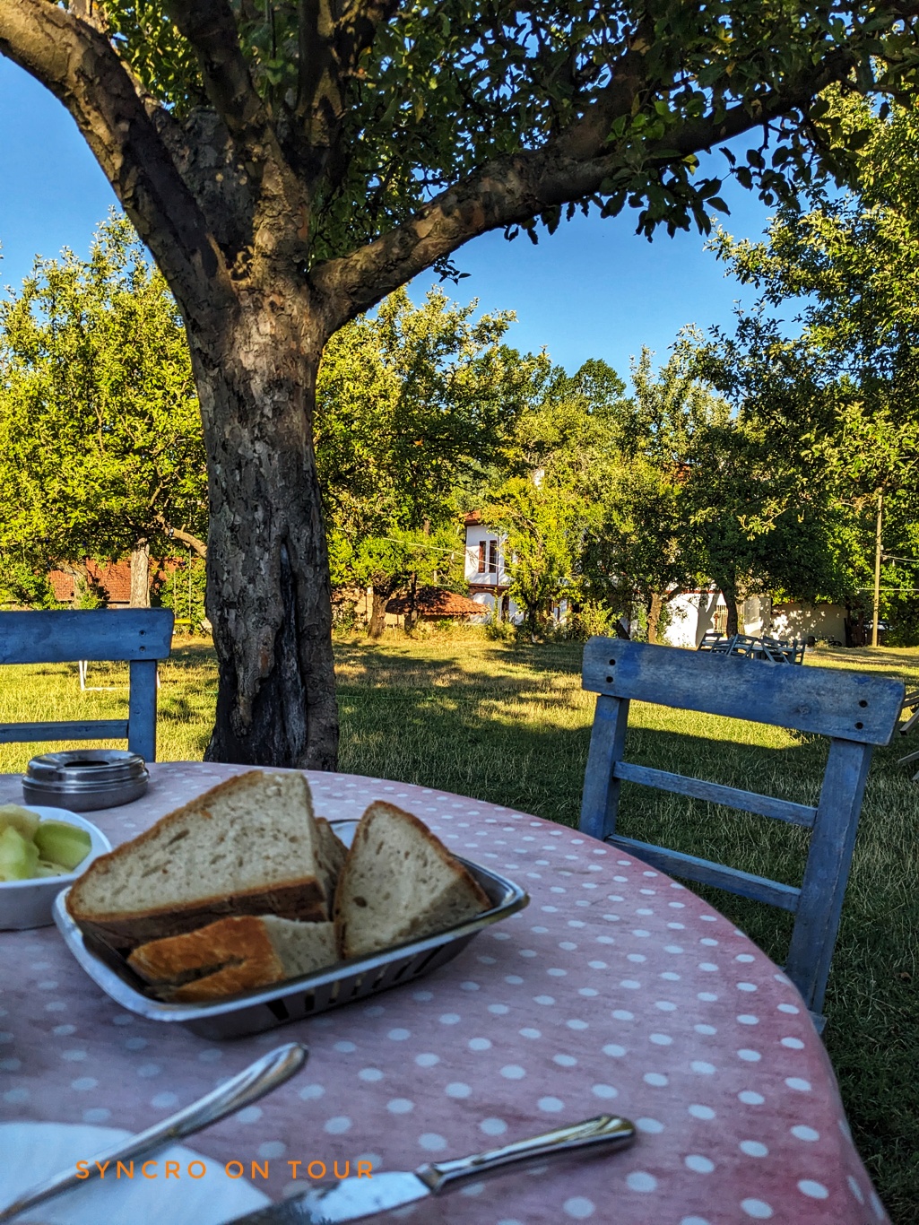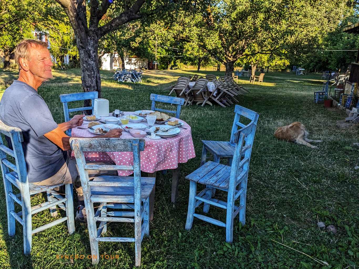 Ein älterer Herr kam zu uns an den Bus und wollte wissen, wo wir herkommen und wo wir hinwollen. Michael sprach ihn auf seinen auffälligen Ring an. Er fragte, ob es der Ring der türkischen Militärakademie sei. Es stellte sich heraus, dass der Herr ein Drei-Sterne-General der türkischen Luftwaffe gewesen war. Na, da hatten die beiden pensionierten Militärs ein Gesprächsthema. Später, als wir zusammen mit weiteren Gästen im Schatten der 260 Jahre alten Linde saßen, erfuhren wir, dass er schon 85 Jahre alt ist und z.B. im Zypernkonflikt 1974 geflogen ist. Nach seiner vierzigjährigen militärischen Zeit hat er auch noch bei der zivilien Luftfahrt als Lehrer gearbeitet. Ein interessanter Mann – mit einer überaus netten Frau.