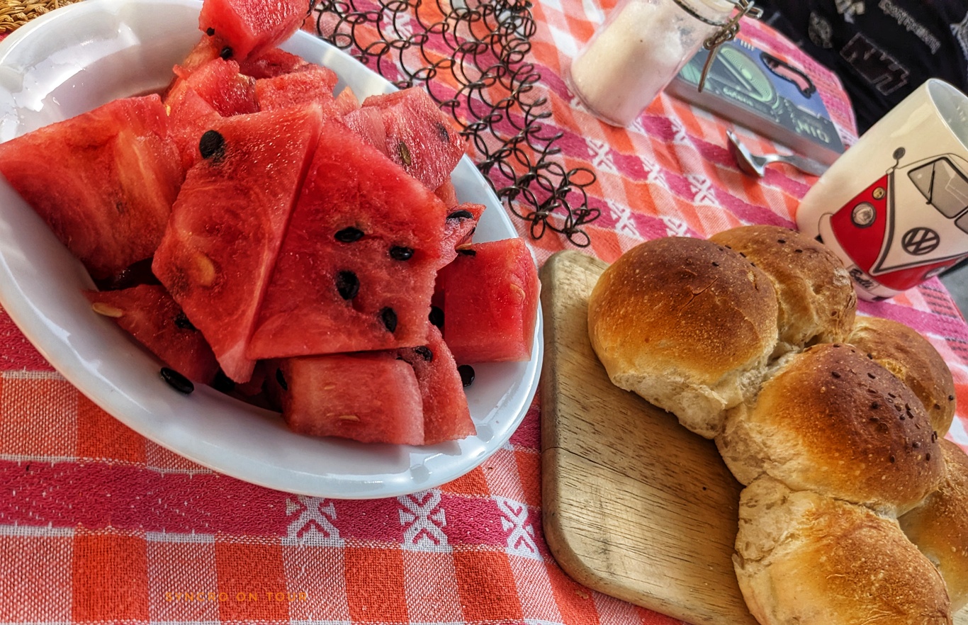 Wir bleiben noch einen Tag und eine Nacht am großen Ararat, weil wir morgen einen Termin in einer Autowerkstatt haben. Ein Ölwechsel ist fällig. Heute ist unser 100. Reisetag bei etwas mehr als 9000 Kilometern. Weil wir nicht besonderes vorhaben, lassen wir uns mit dem Frühstück viel Zeit. Wir laden einen anderen Gast auf eine Tasse Kaffee zu uns an den Tisch. Es ist Murhat aus Batman, der ein paar Tage mit seinem Motorrad herumreist. Er lehrt an der Universität von Batman als Professor für archeologische Töpferwaren (soweit wir das richtig verstanden haben). Während wir noch sitzen und sprechen, bringt uns unser Campingplatzwirt frisches Brot an den Tisch. Die beiden Fahrradfahrerinnen aus Deutschland haben noch Wassermelone übrig.