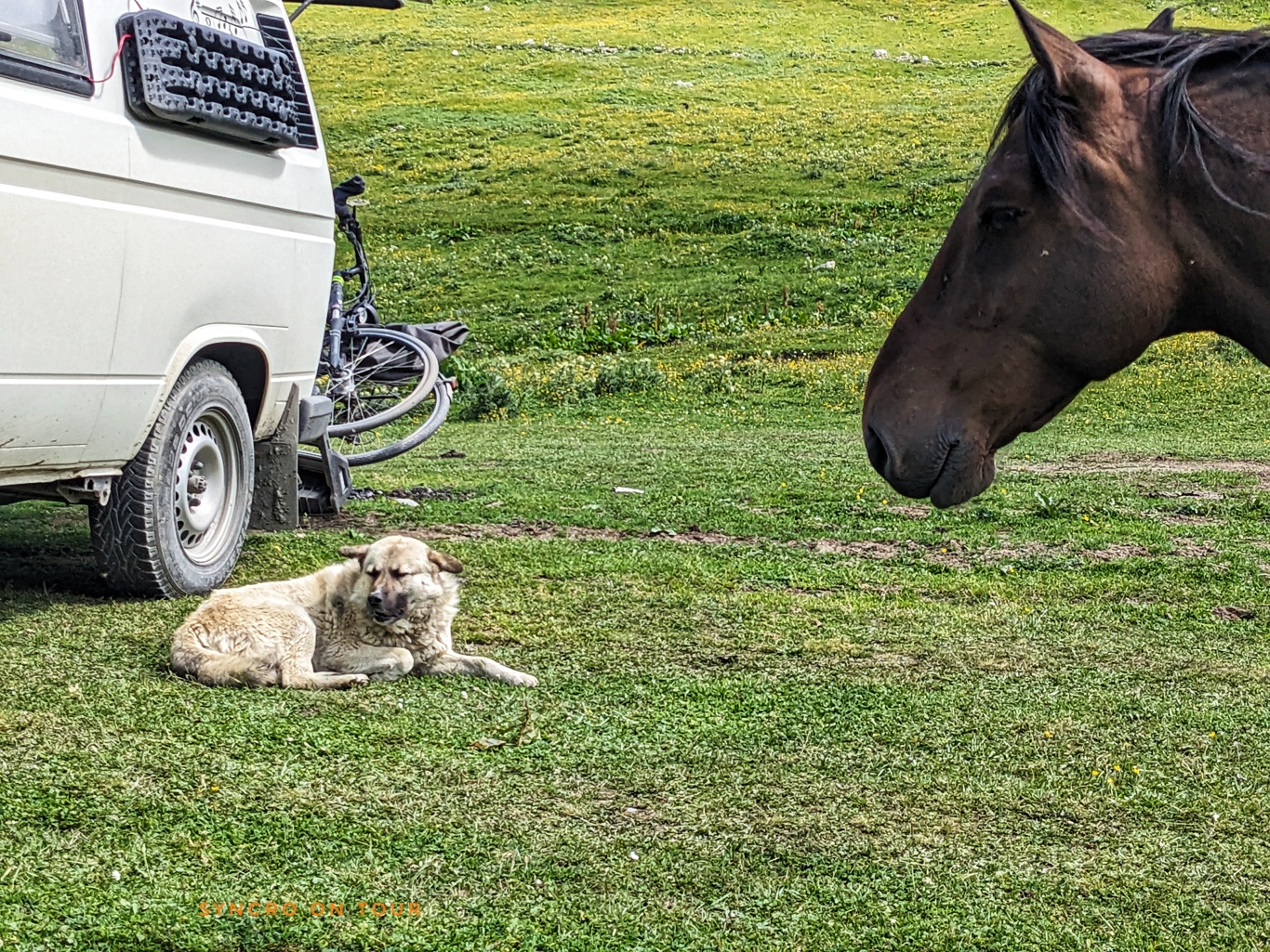 Mittlerweile haben wir einen eigenen Wachhund am Bus. Er sorgt dafür, dass uns die Kühe nicht belästigen. Er würde gerne auch die Pferde verscheuchen, aber die lassen sich von seinem Gebellt nicht einschüchtern.