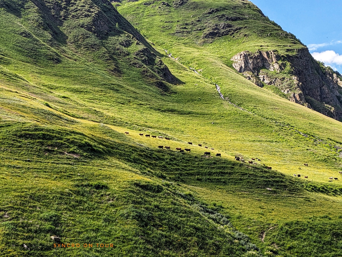 Apropos Kühe. Es ist wunderbar, mit anzusehen, wie die Herde morgens hinauf auf die Weiden wandert und abends pünktlich zurück ins Dorf geht. Alles geht sehr geordnet und sehr geruhsam vor sich. Es hat etwas meditatives, den Tieren bei ihren täglichen Wanderungen zuzuschauen.