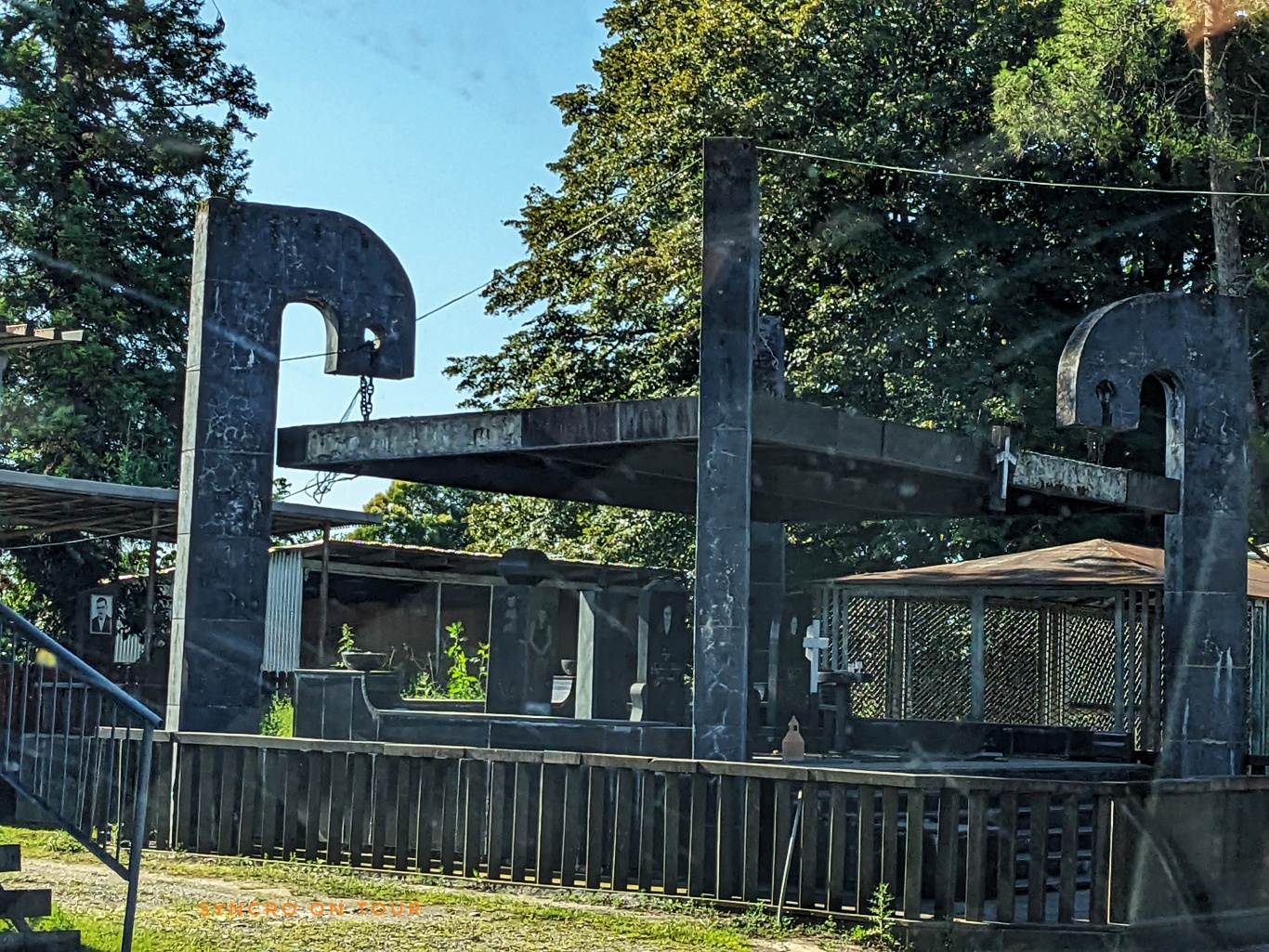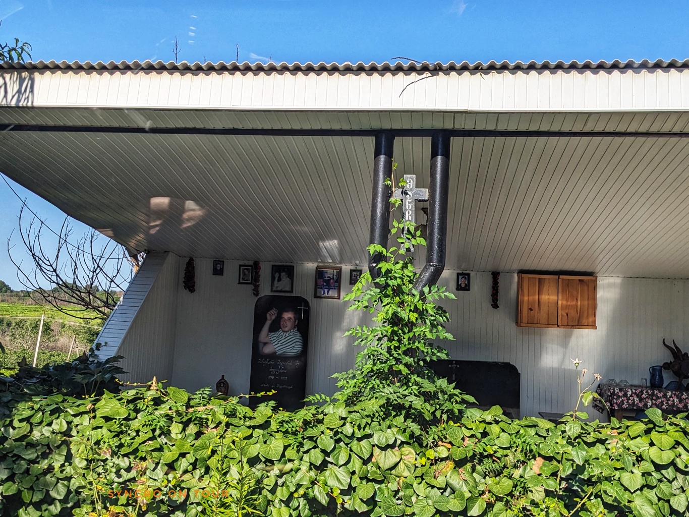 Was uns besonders gewundert hat, war die Begräbniskultur. Wir hatten schon überall in Georgien gesehen, dass sich die Verwandten eines Toten am Grab versammeln, um dort nicht nur zu beten oder Kerzen anzuzünden, sondern auch, um dort gemeinsam auf den Toten anzustoßen oder gar am Grab zu essen. Dafür gibt es dann immer auch passende Sitzgelegenheiten, meist ein einfacher Tisch mit zwei Bänken an den Längsseiten. Hier fanden wir entlang der Straße individuelle Häuschen, vergleichbar einem Garten mit Zaun und Schattendach zur Straße hin geöffnet. An den Wänden dieser „Häuser“ hängen große Bilder des Verstorbenen und es gibt gemütliche Sitzgelegenheiten zum ausgiebigen Feiern. Jede Gedenkstätte ist anders gestaltet. Wir sahen viele dieser Erinnerungsorte entlang der Straße.