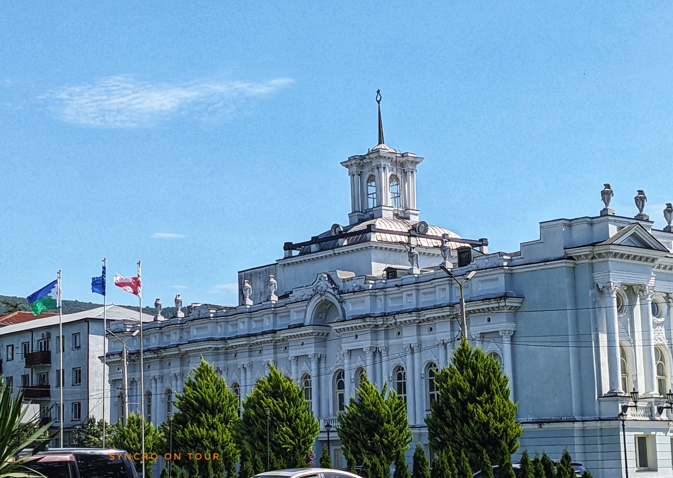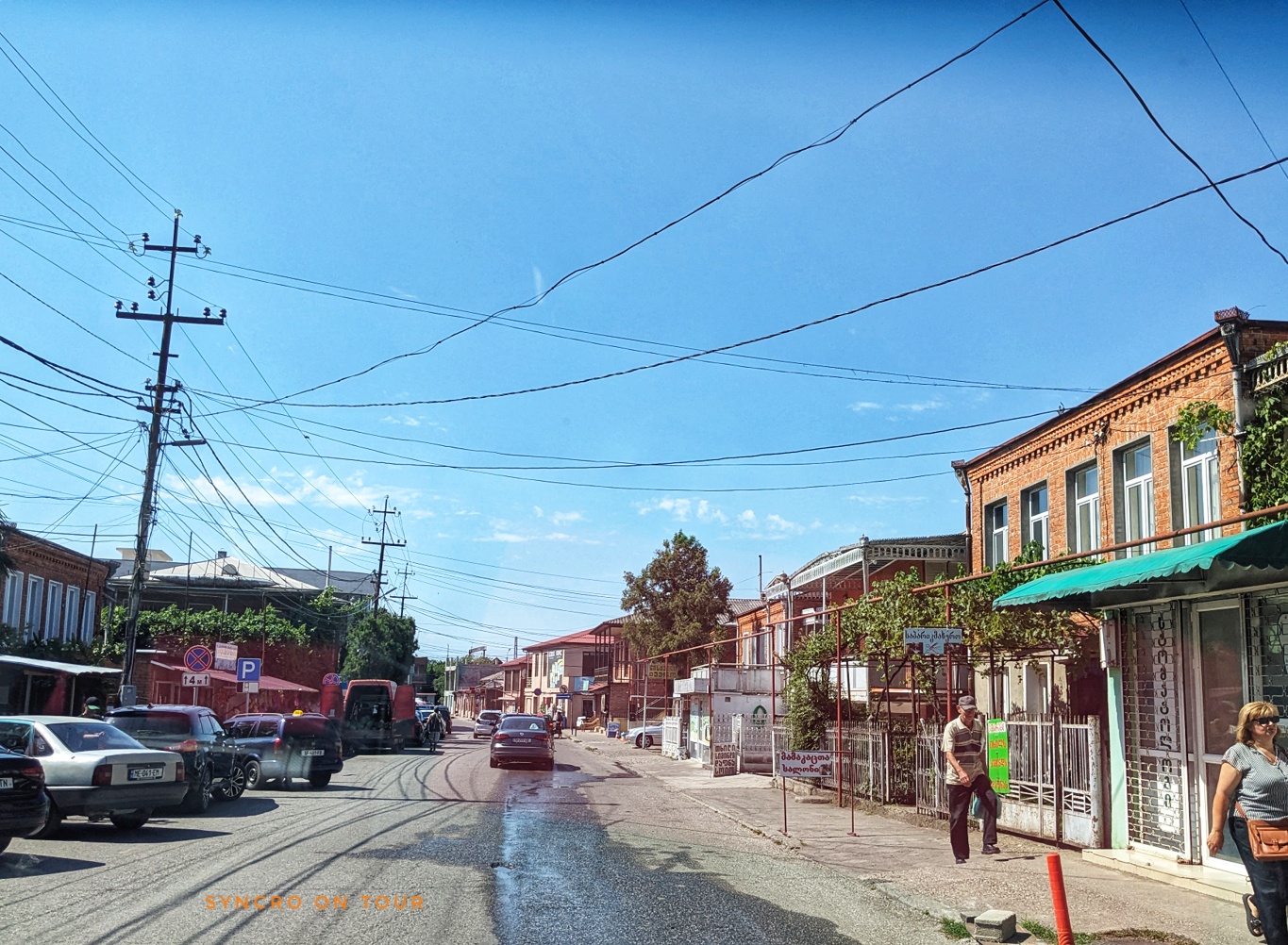 Wir kamen ins Städtchen Senaki, wo wir anhielten, um einzukaufen. Wir hielten direkt am wunderschönen Stadttheater von Senaki unter einem großen Baum. Wir kauften Motoröl für den Bus, Lebensmittel im Supermarkt und Obst und Gemüse beim Gemüsemann an der Straße. Dann machten wir noch einmal einen Bummel über den Basar. Hier lachte mich eine giftgrüne Paste an, die ich probieren durfte. Es handelt sich wahrscheinlich um eine Art Koreander-Pesto und schmeckte sehr intensiv. Ich musste ein Töpfchen davon mitnehmen.
