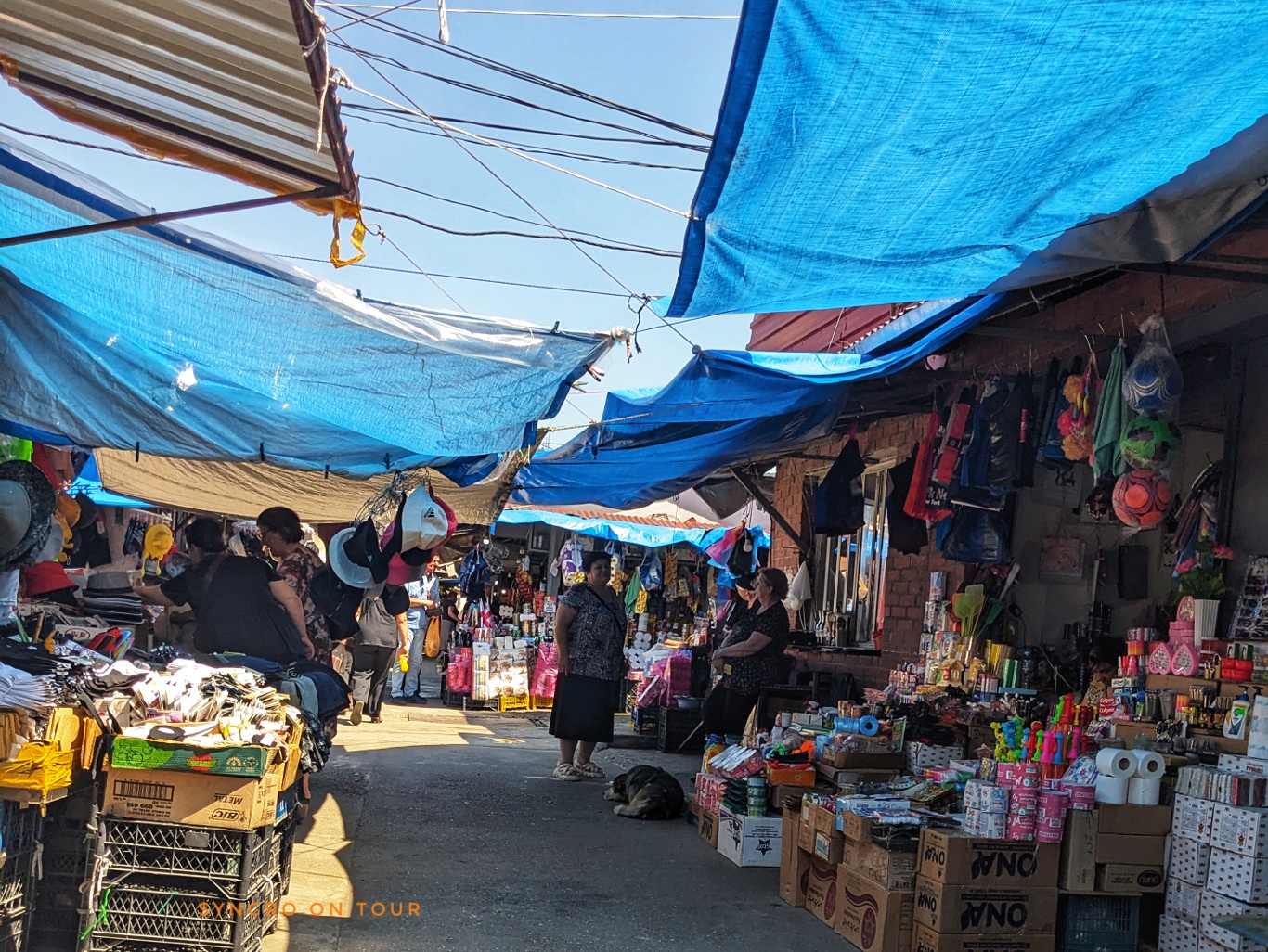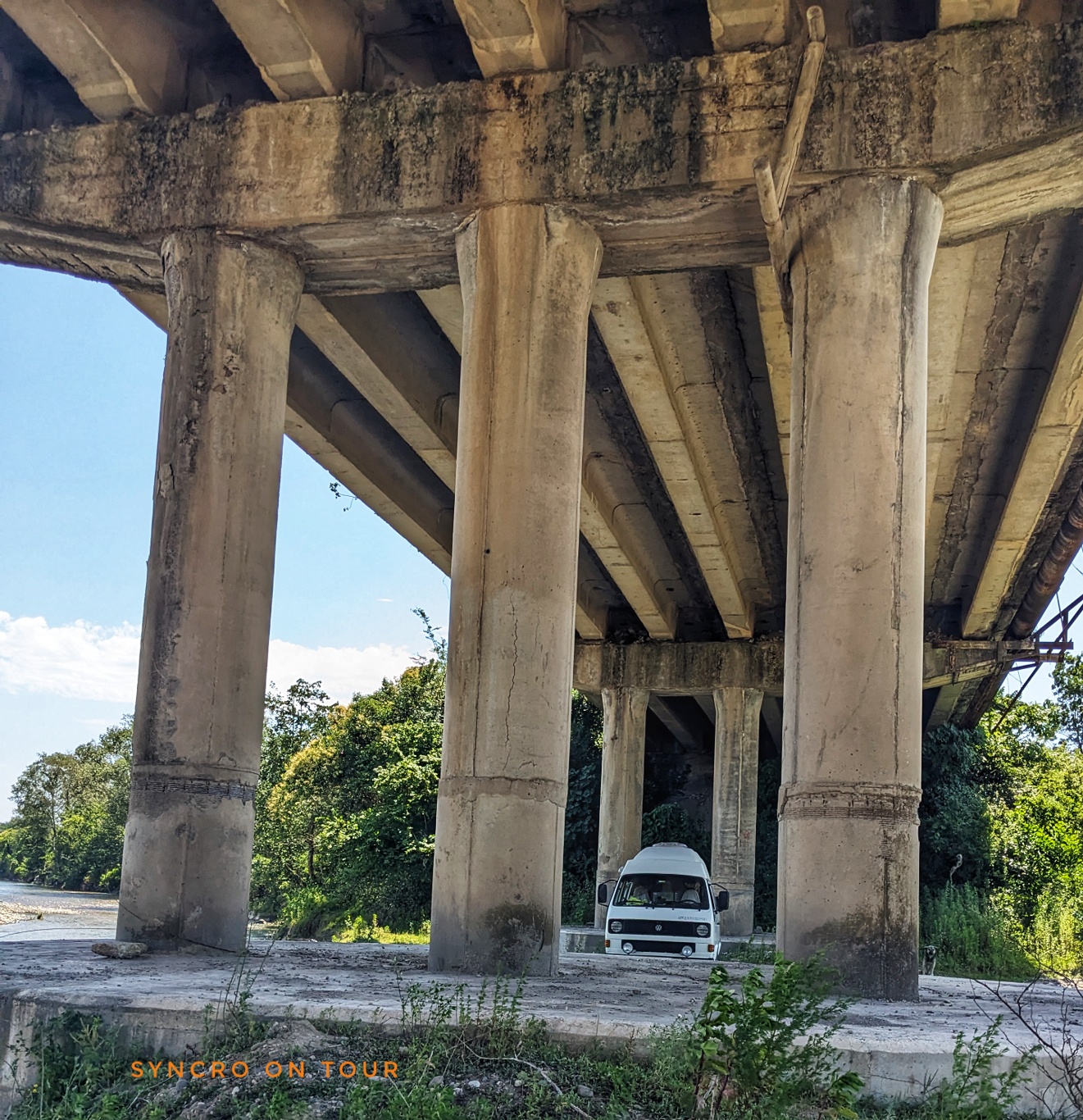 Es war fast Zeit für unser Mittagessen. Dafür fuhren wir aus der Stadt hinaus und fanden einen Platz im Schatten unter einer hohen Brücke direkt am Fluss Tekhuri. Es wehte ein sehr starker Wind, der unseren Schweiß etwas trocknete. Aber es blieb auch dort sehr warm. Da es kein besonders schöner Ort war, fuhren wir nach dem Essen direkt weiter.