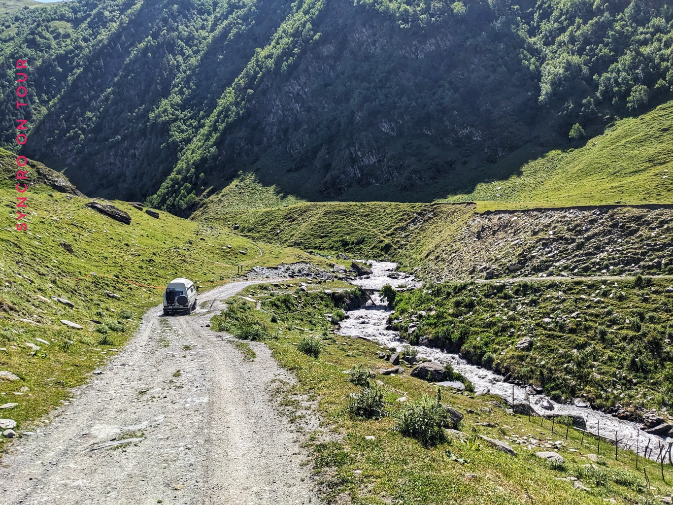 Kaum waren wir wieder losgefahren, stießen wir auf Anna und Gerhard, sie Russin, er Deutscher, die in Dubai wohnen und arbeiten. Sie sind 12 Tage in Georgien mit einem gemieteten 4×4 mit Dachzelt unterwegs. Sie bewunderten ein wenig neidisch unseren Bus.