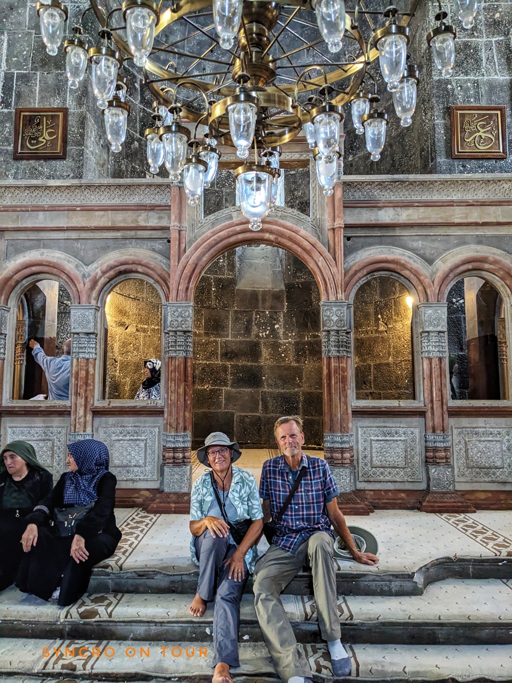 Wieder unten suchten wir nach Kühle in der Kathedrale der Heiligen Apostel (Surb Arakelots). Diese war eine armenische Kirche aus dem 10. Jahrhundert, die über die Jahrhunderte als Moschee, russisch-orthodoxe Kirche und Museum diente. Drinnen bekamen wir ungefragt eine kleine Führung von einem etwa 16 Jahre alten Jungen. Er erklärte uns sehr freundlich und auf Englisch was er über die Kirche wusste. Er zeigte mit einer Taschenlampe auf verschiedenen Details an der Decke und ging mit uns in hintere Räume, die wir selbst sicher nicht entdeckt hätten. Zum Schluss machte er ein Foto von uns auf den Stufen unter dem riesigen Kronleuchter. Wir gaben ihm gerne etwas Geld für seine Dienste.