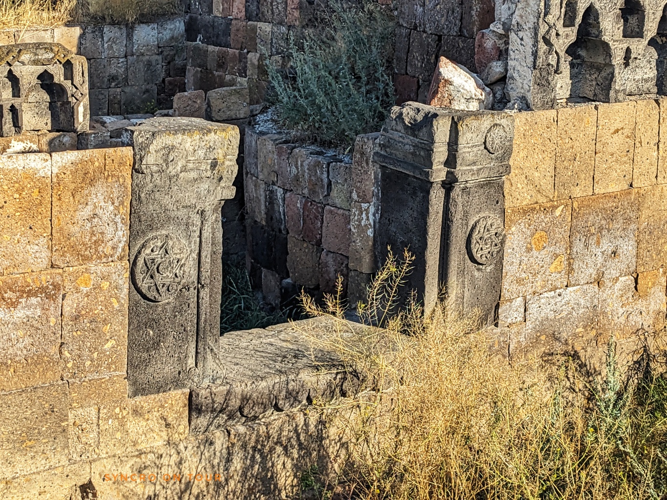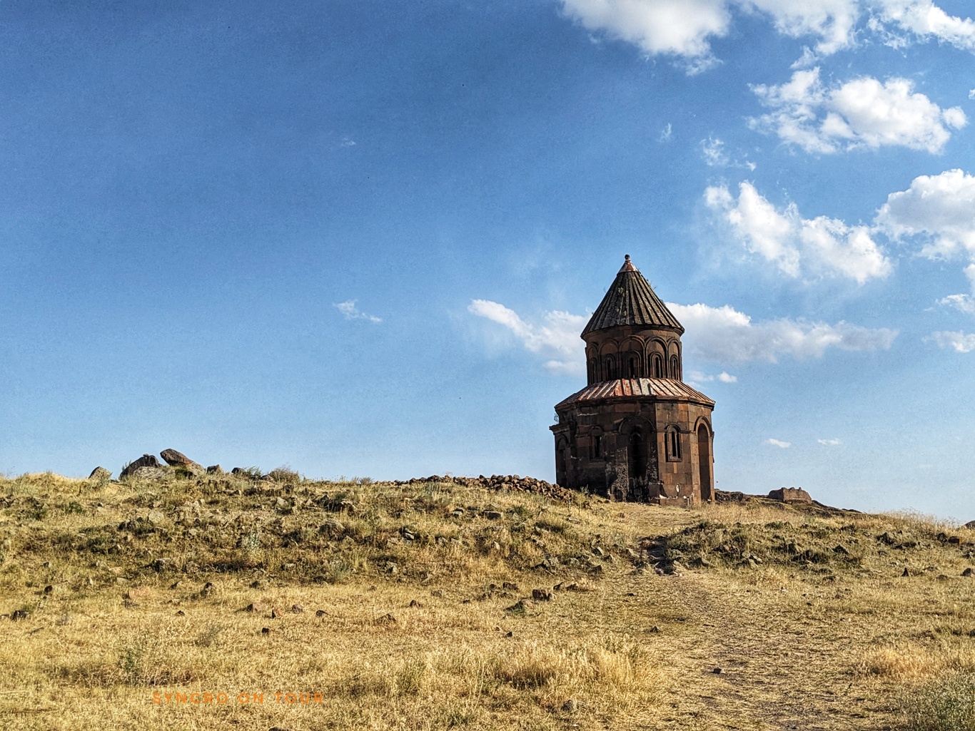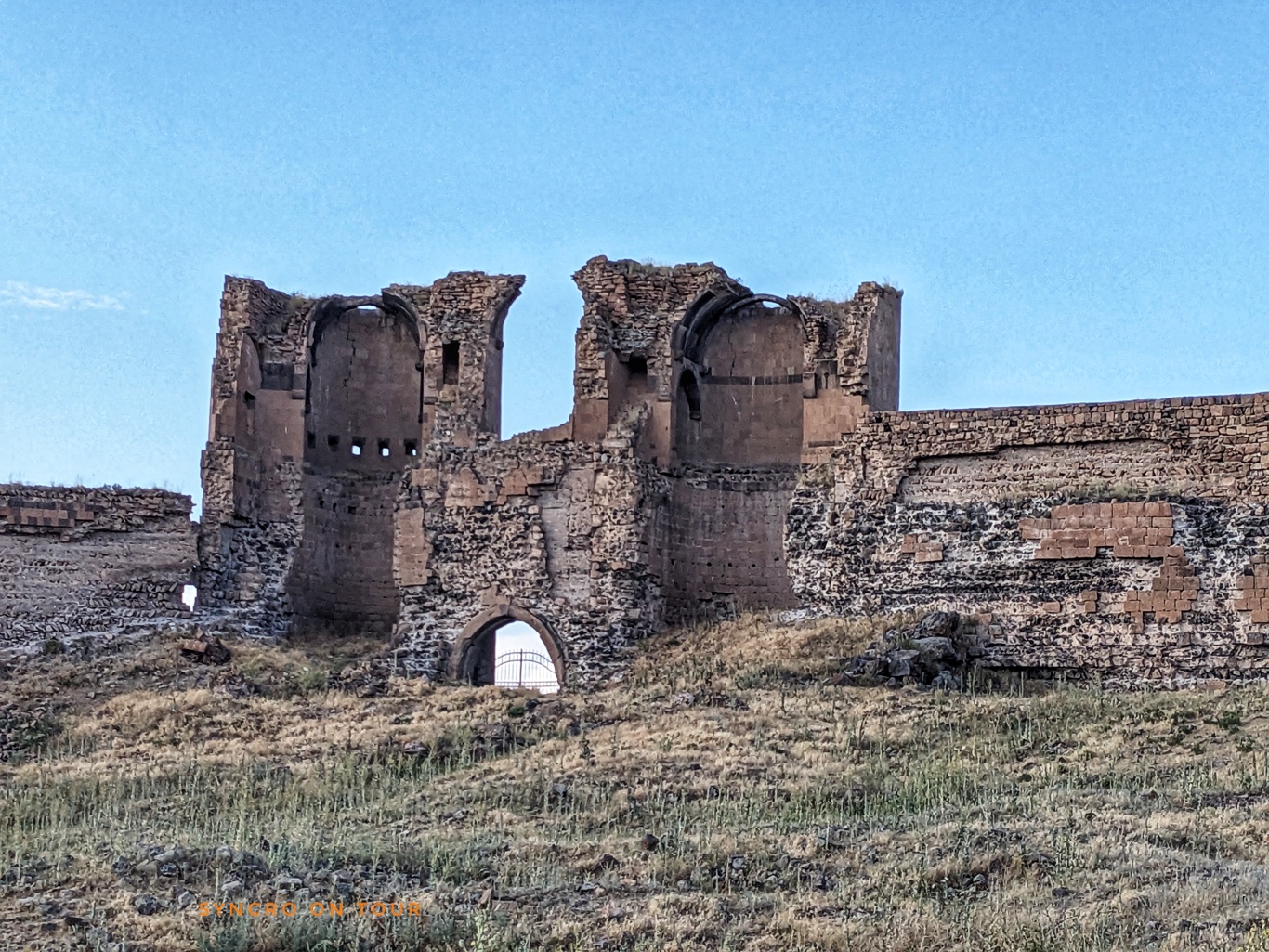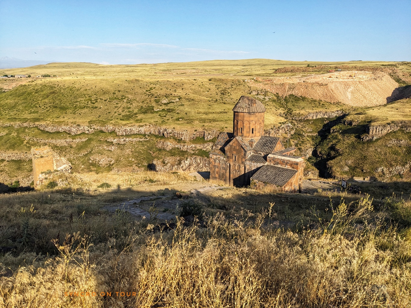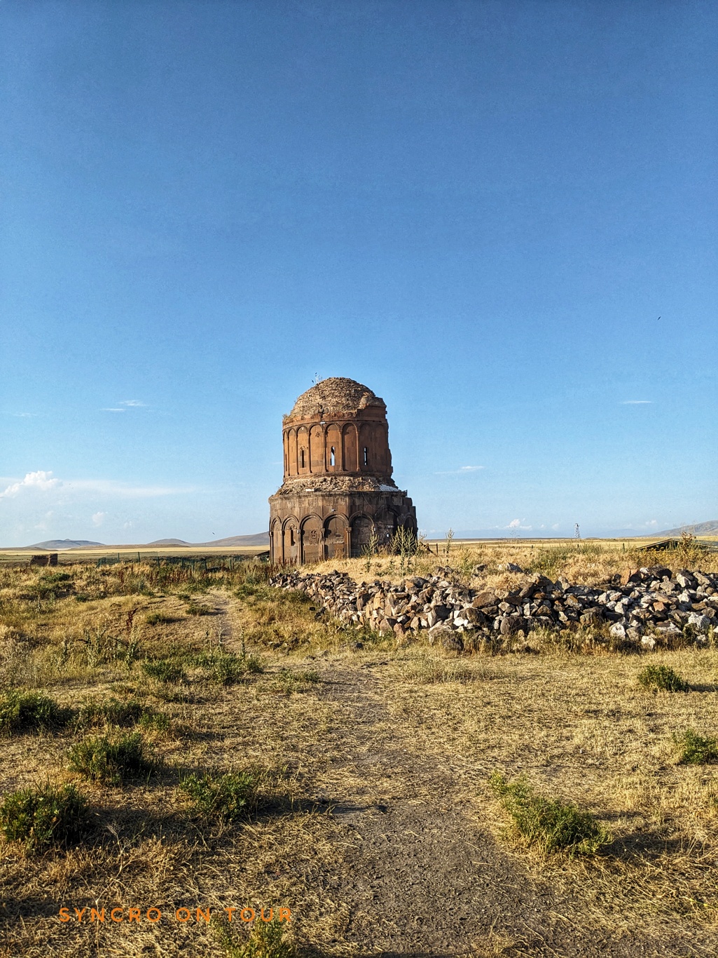 Nun ging es weiter zur uralten Ruinenstadt von Ani. Hier siedelten Menschen lange vor Christus. Die Stadt beherbergte zeitweise bis zu 100000 Menschen und war eine alte armenische Hauptstadt. Später war sie Teil des osmanischen Reiches. Dann gehörte sie von 1878 bis 1917 zum russischen Reich. Bis 1920 war sie kurz wieder armenisch. Danach – siehe oben. Heute sind auf dem weiten Areal direkt an der Grenze nur noch wenige Gebäude als Ruinen erhalten. Wir sind fast zwei Stunden herumgewandert und waren sehr beeindruckt. In der Ferne sahen wir den Aragat (!), den viergipfeligen Vulkan, der heute der höchste Berg Armeniens ist.
