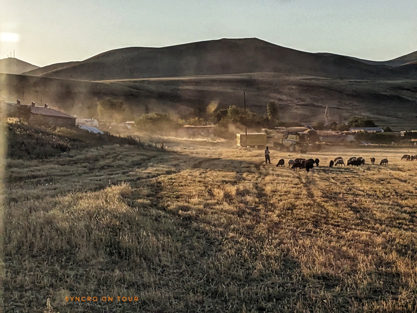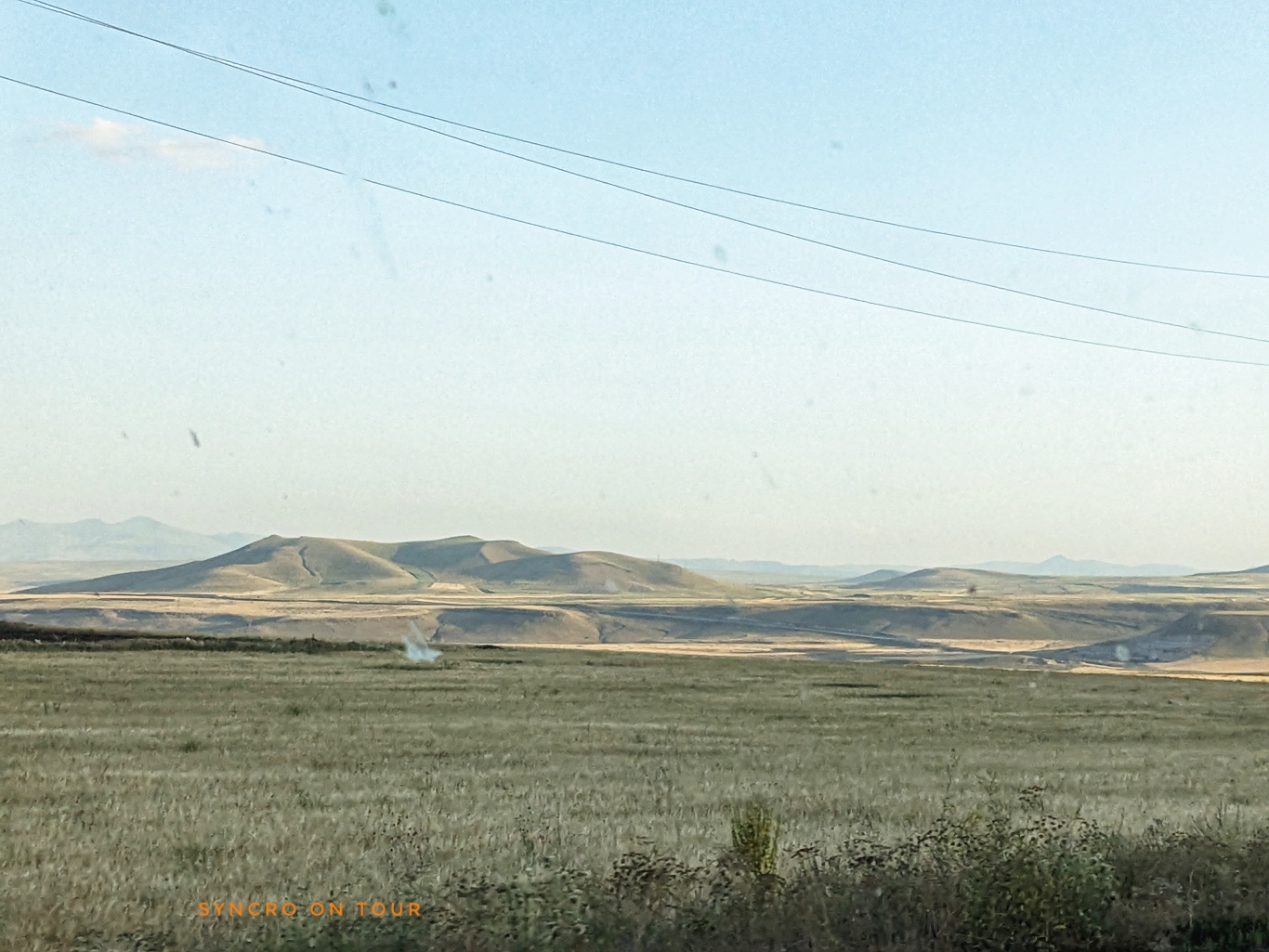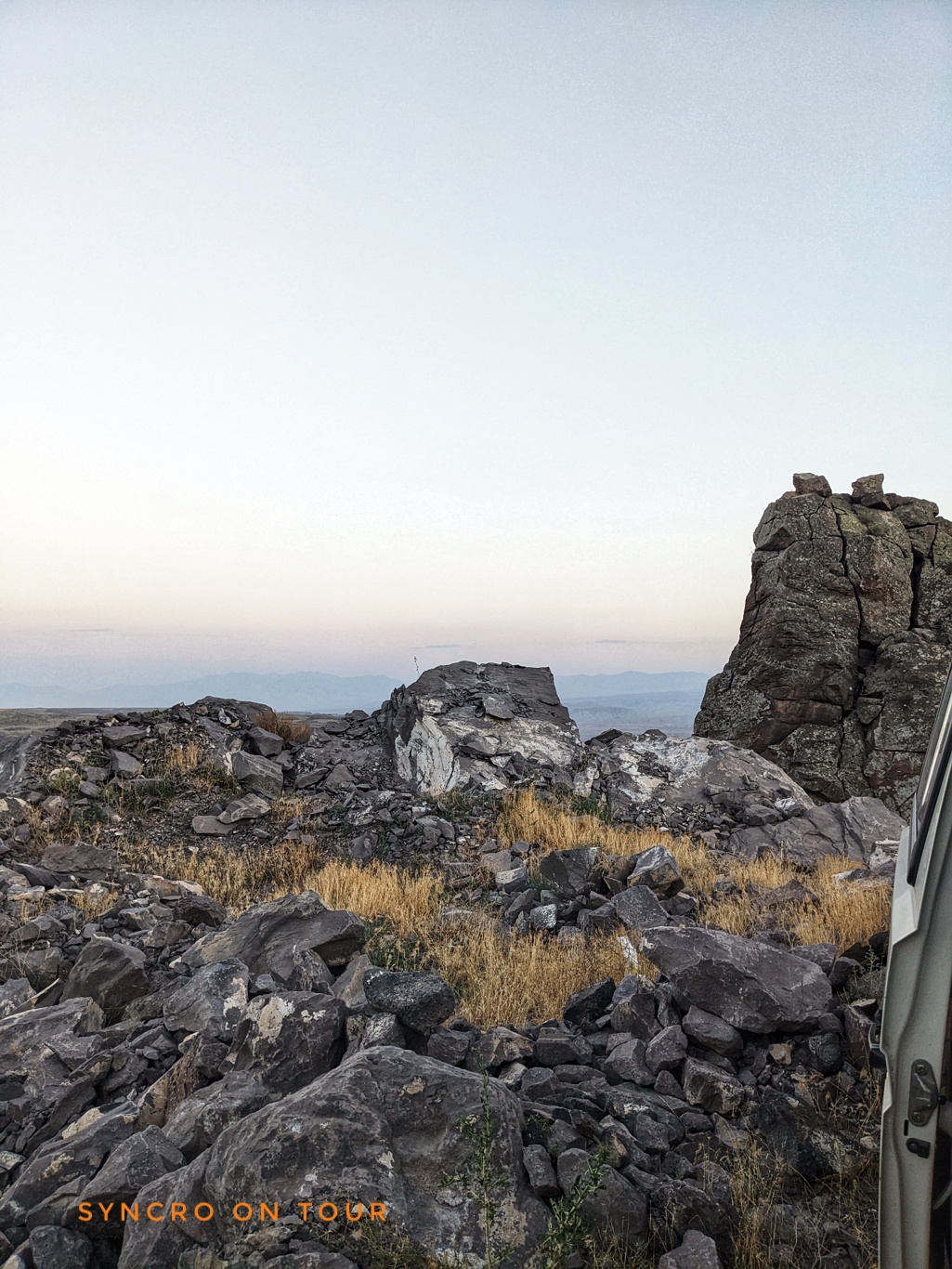 Wir fuhren im letzten Abendsonnenschein weiter auf der Straße Richtung Ararat, türkisch Ağrı Dağı, tankten in Digor und fanden mitten in einer unwirklichen Felsenlandschaft einen Stellplatz mit Aussicht. Am Horizont war schemenhaft schon der Ararat zu erahnen. Es war ein sehr lauer Sommerabend, den wir gerne noch länger draußen genossen hätten. Doch die Mücken haben uns in den Bus getrieben. Die Nacht werden wir mit viel Durchzug und leichter Kleidung gut überstehen.