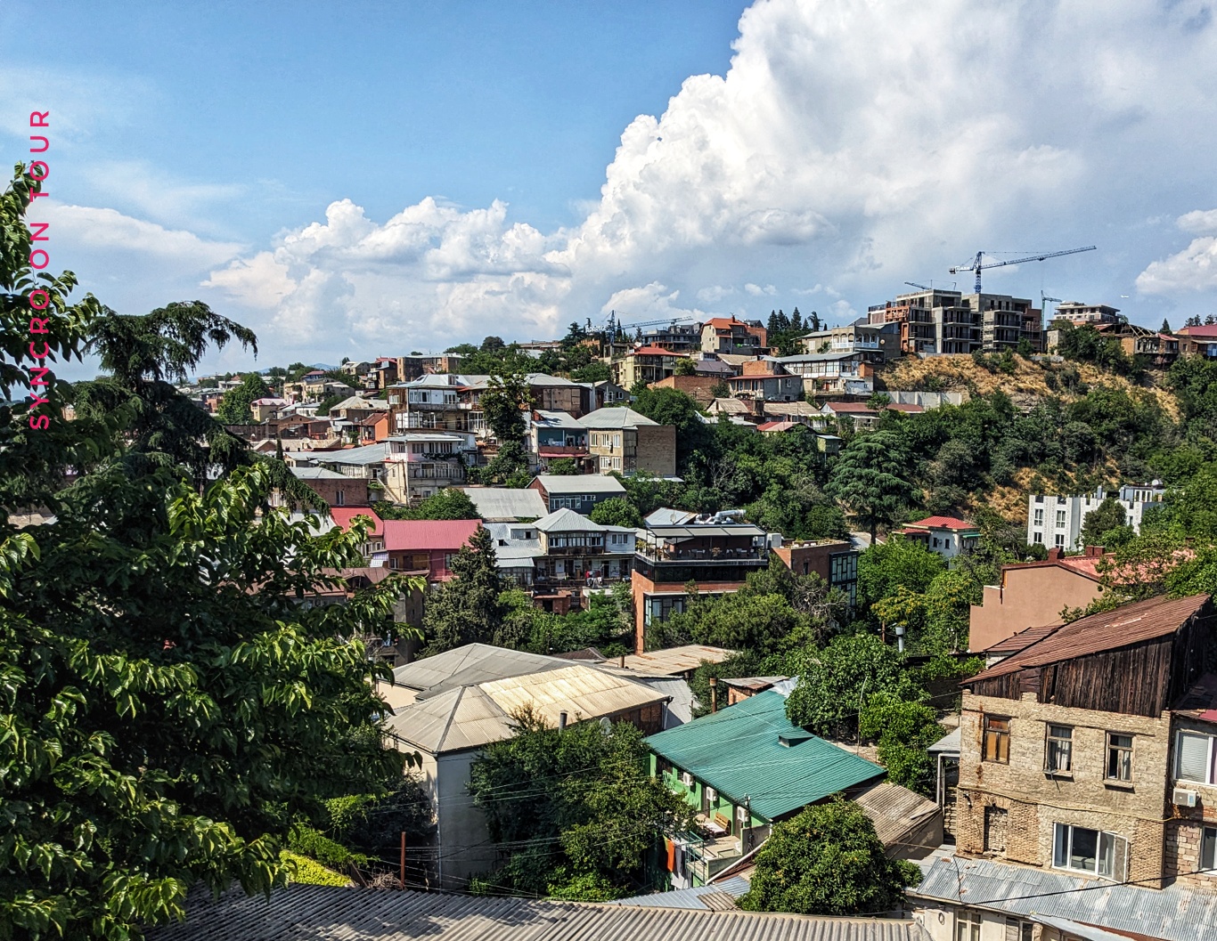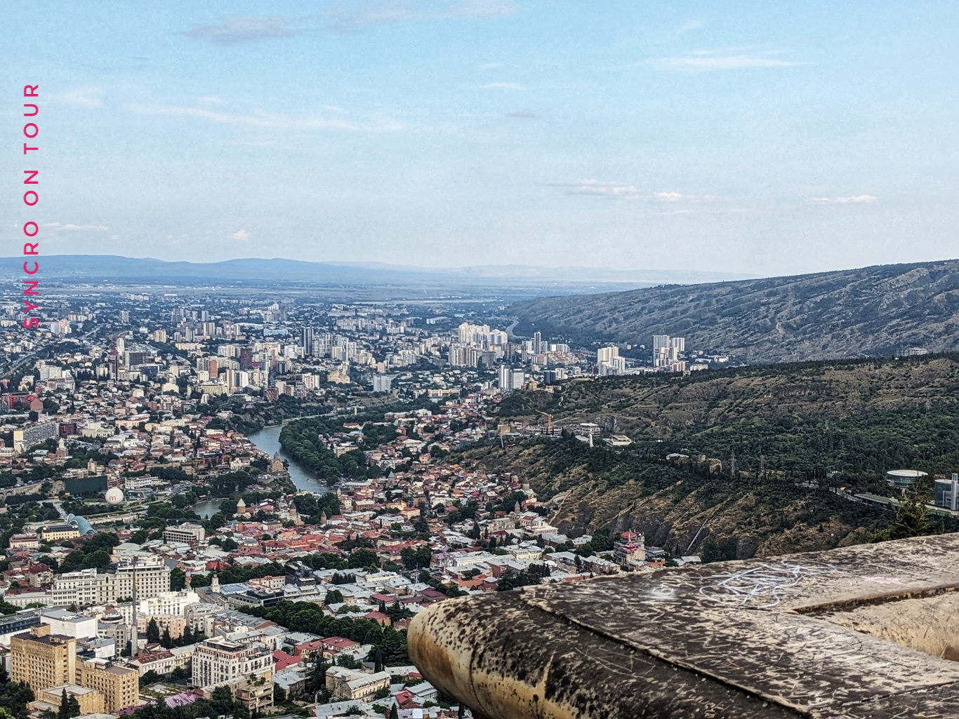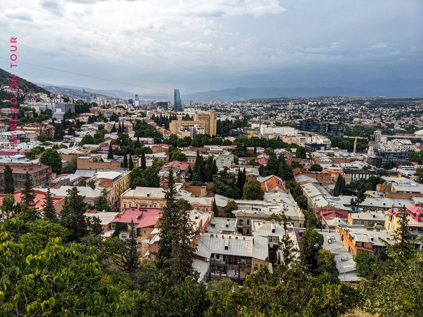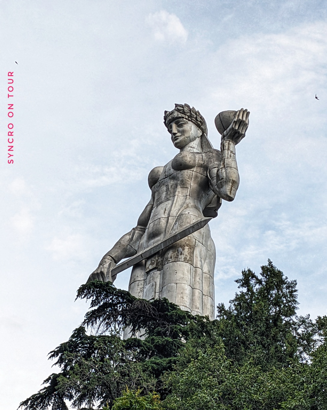Wir machten uns erst am Nachmittag wieder auf den Weg in die Stadt. Wir ließen uns treiben und entdeckten so den Flohmarkt an der „Dry Bridge“ und ein kleines Lokal, das schöne schattige Sitzgelegenheiten bot. Dort tranken wir etwas Kühles und lauschten der Musik des Stehgeigers. Anschließend kamen wir durch einen Park immer weiter hinauf in Richtung Mtatsminda-Park. Wir mussten nicht den ganzen Weg auf diesen Berg kraxeln, die Funikolare nahm uns mit hinauf. Von dort sind wir in einem großen Bogen immer zwischen Büschen und Blumen bis zur anderen Seite der Altstadt gelaufen. Dort steht die zwanzig Meter hohe Statue „Kartvlis Deda“ (Mutter von Georgien), die von fast jedem Punkt der Stadt zu sehen ist. Von dort ging es noch einmal eine Menge Stufen hinunter in die Stadt. Am Horizont sahen wir dunkle Wolken aufziehen, so dass wir uns etwas beeilten, um zurück zum Bus zu kommen, der ja noch einmal eine Menge Stufen oberhalb des andern Ufers der Kura liegt.