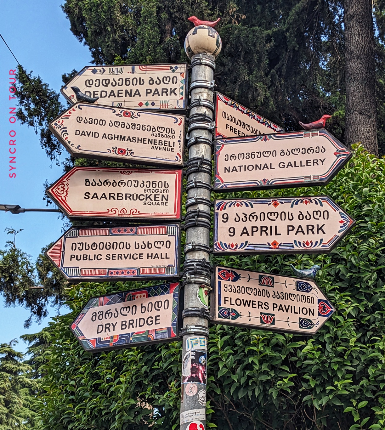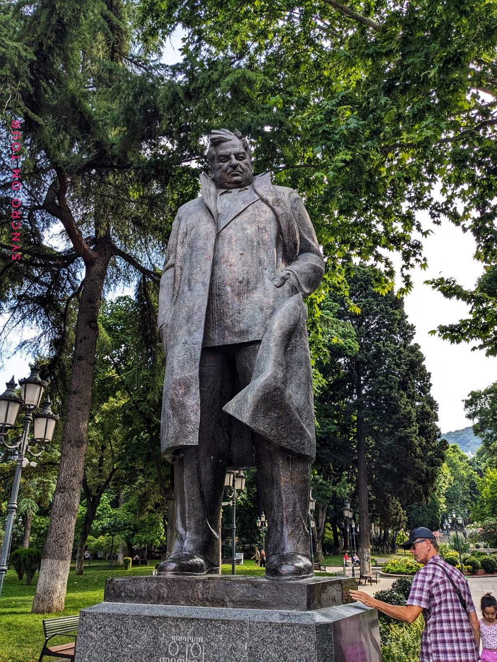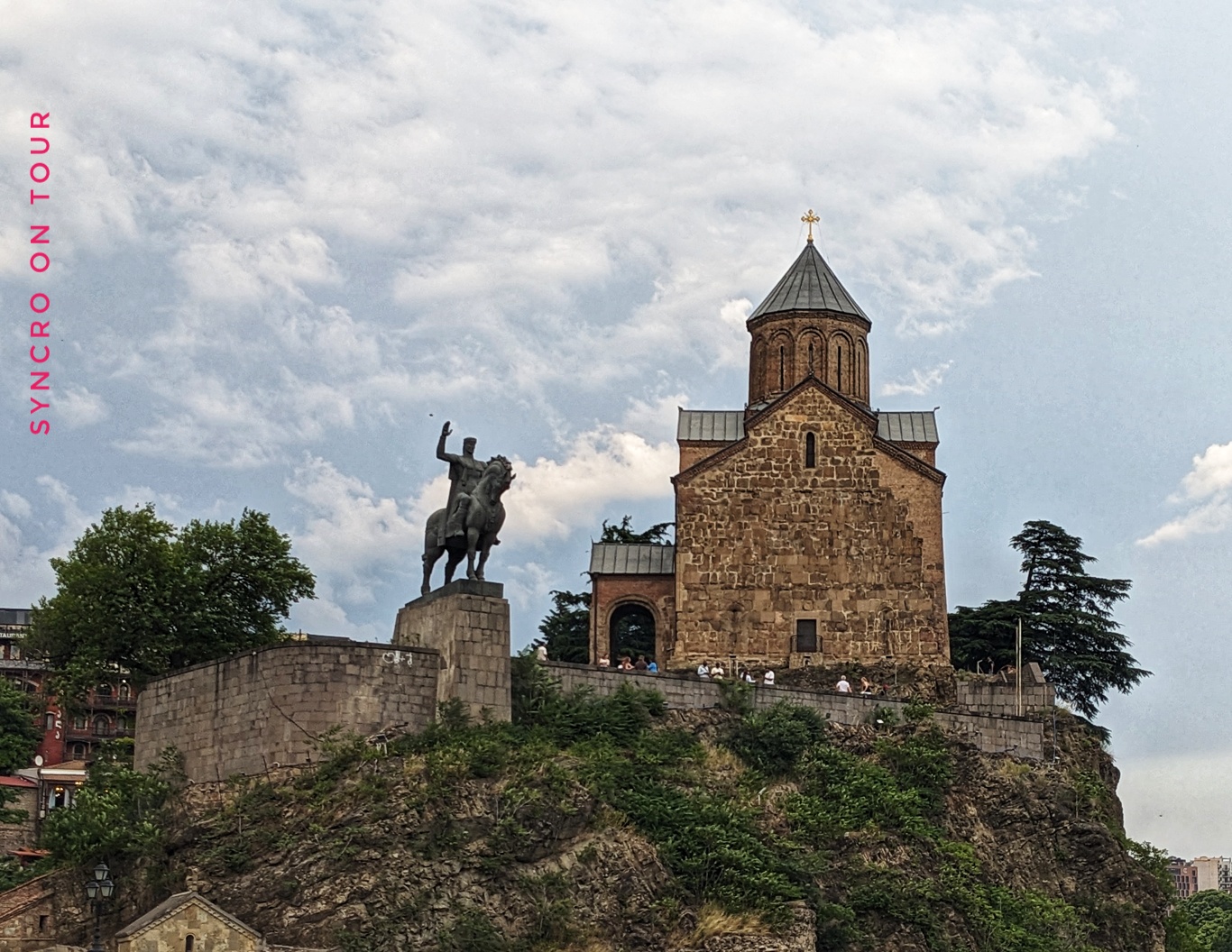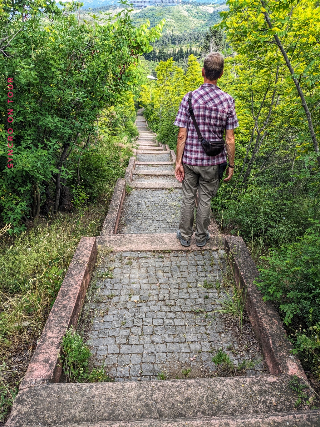 Wir machten uns erst am Nachmittag wieder auf den Weg in die Stadt. Wir ließen uns treiben und entdeckten so den Flohmarkt an der „Dry Bridge“ und ein kleines Lokal, das schöne schattige Sitzgelegenheiten bot. Dort tranken wir etwas Kühles und lauschten der Musik des Stehgeigers. Anschließend kamen wir durch einen Park immer weiter hinauf in Richtung Mtatsminda-Park. Wir mussten nicht den ganzen Weg auf diesen Berg kraxeln, die Funikolare nahm uns mit hinauf. Von dort sind wir in einem großen Bogen immer zwischen Büschen und Blumen bis zur anderen Seite der Altstadt gelaufen. Dort steht die zwanzig Meter hohe Statue „Kartvlis Deda“ (Mutter von Georgien), die von fast jedem Punkt der Stadt zu sehen ist. Von dort ging es noch einmal eine Menge Stufen hinunter in die Stadt. Am Horizont sahen wir dunkle Wolken aufziehen, so dass wir uns etwas beeilten, um zurück zum Bus zu kommen, der ja noch einmal eine Menge Stufen oberhalb des andern Ufers der Kura liegt.