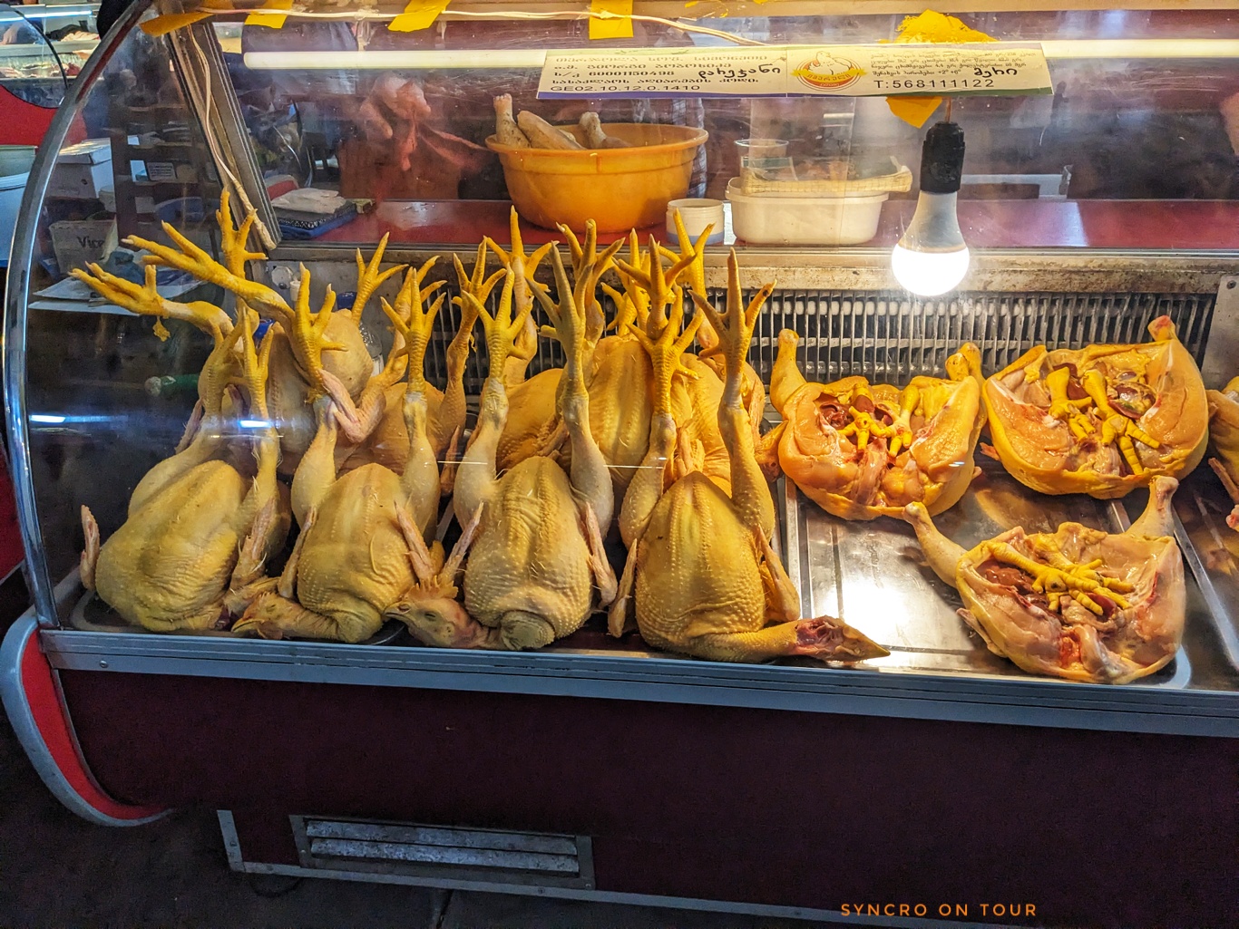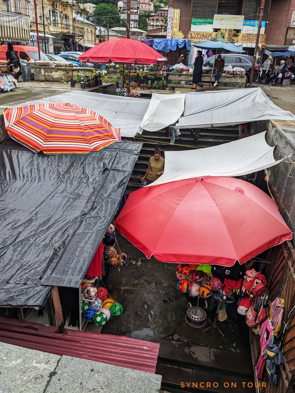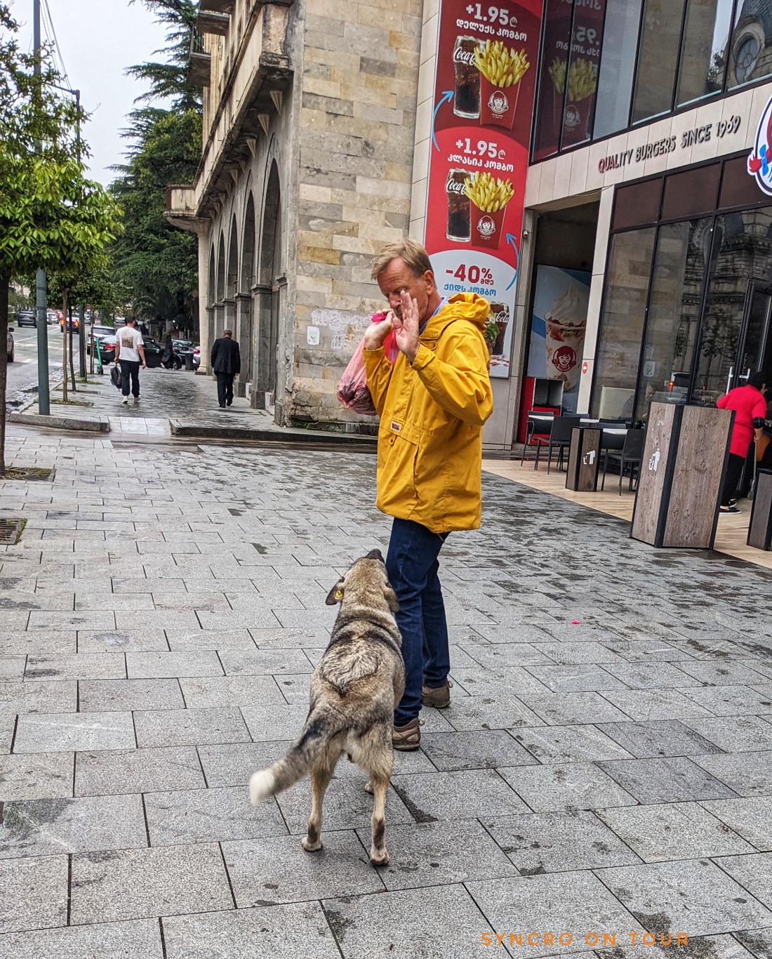 Wirklich sehenswert ist der große Markt, der unterirdisch und auf Straßenniveau alles anbietet, was mensch so braucht. Vor allem frisches Gemüse, Obst, Käse, Fisch, Fleisch, Gewürze. Wir können bei den dicken Knubberkirschen nicht nein sagen und kaufen uns auch zwei Tütchen vom svanetischen Gewürzsalz, das uns von Kirsten vor drei Tagen wärmstens empfohlen wurde. Michael findet einen Bäcker, der Sesamringe verkauft. Er beißt schon auf der Straße in den ersten hinein und erweckt damit die Aufmerksamkeit aller Straßenhunde.