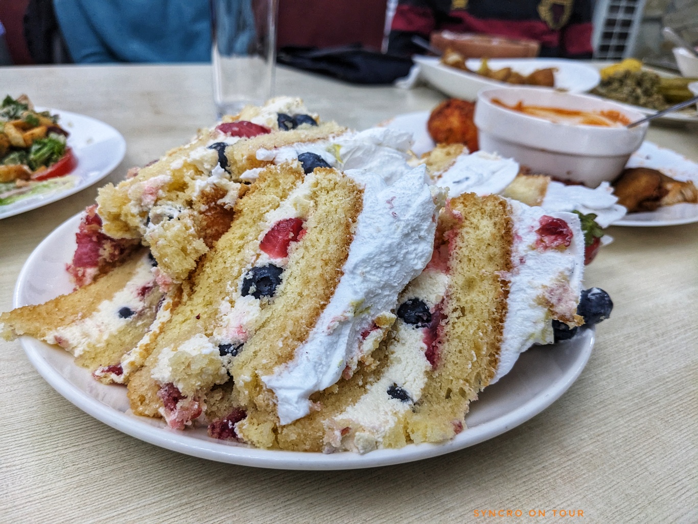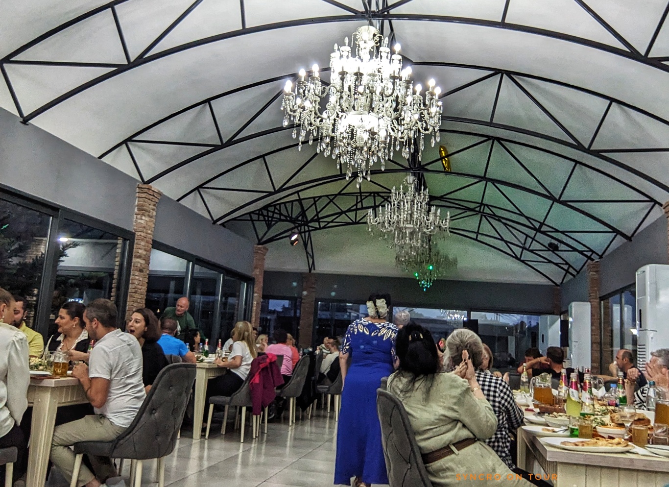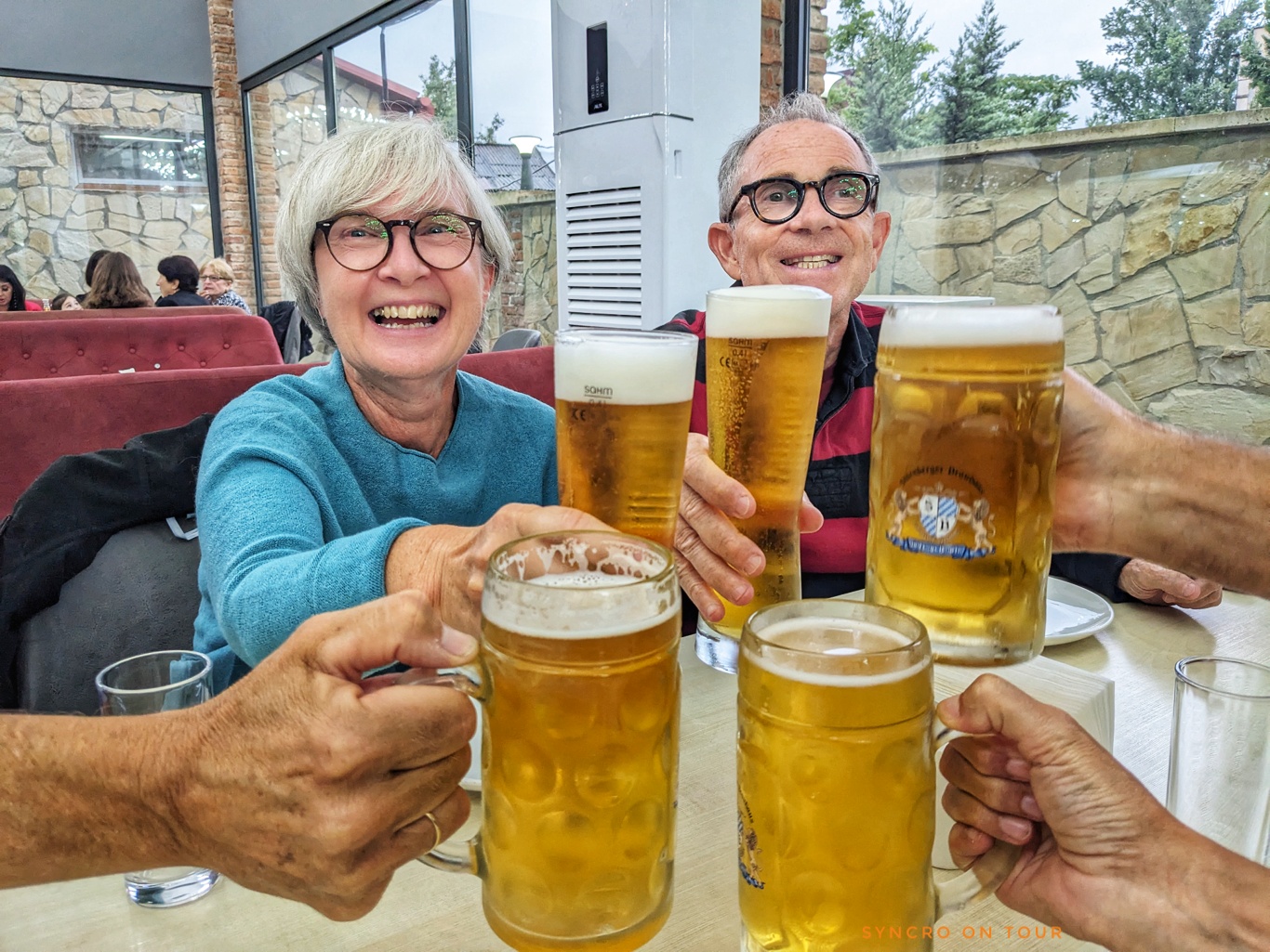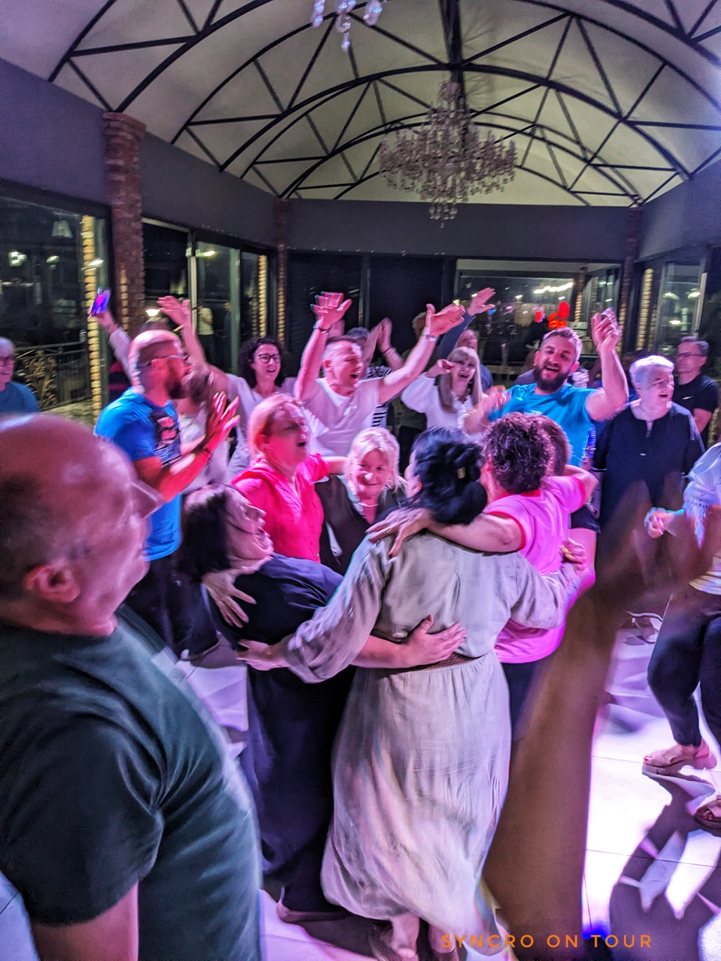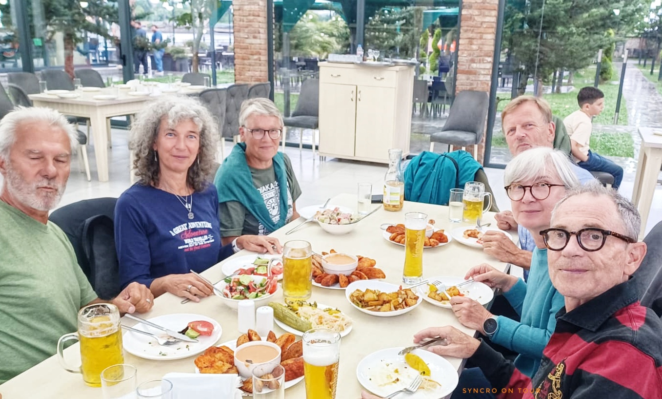 Es gab einige Geburtstage im Saal zu feiern. Als wir schon fast bereit zum Aufbruch waren, vor allem weil kein Dessert auf der Karte stand, bekamen wir vom Nachbartisch einen Teller mit Kuchen auf den Tisch gestellt. Eine Kellnerein war so aufmerksam, uns Teller und Besteck dafür zu bringen. Pavel, der auch russisch spricht, hat sich in unser aller Namen beim Geburtstagskind, einer gerade 70 Jahre gewordenen Dame, bedankt. Er kam mit einem großen Glas Wein zurück zum Tisch. Der war allerdings nach seiner Meinung nicht genießbar. Mittlerweile waren alle auf uns aufmerksam geworden und wir konnten nicht umhin, bei der großen Polonaise durch den ganzen Saal mitzutanzen. Sie endete auf der Tanzfläche, wo zu sehr lauter Musik rund um das Geburtstagskind ausgelassen getanzt wurde. Wir mittendrin!