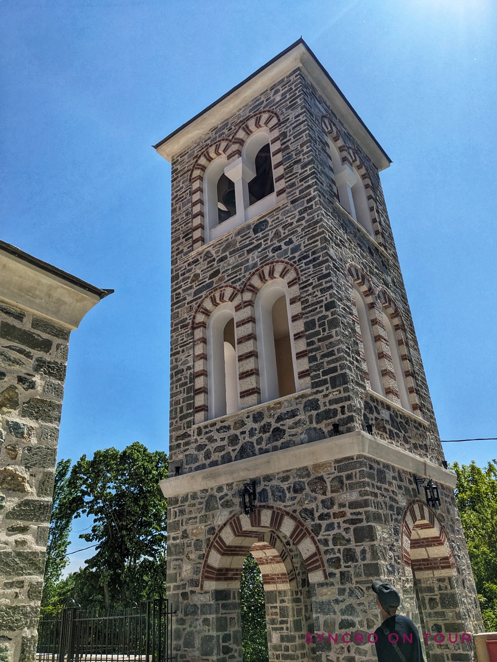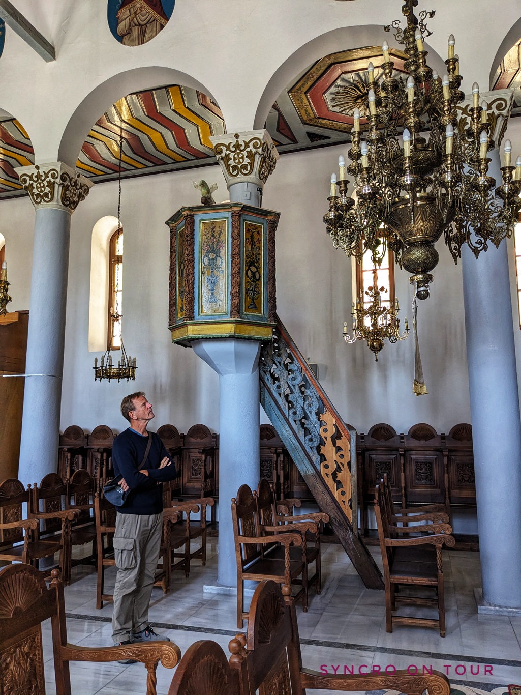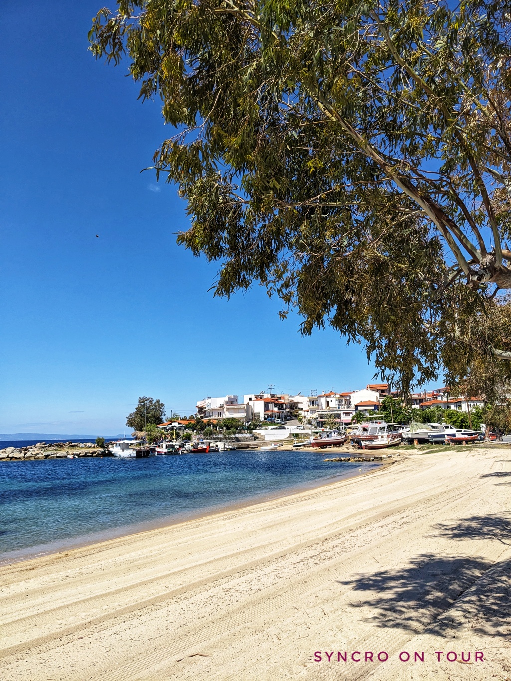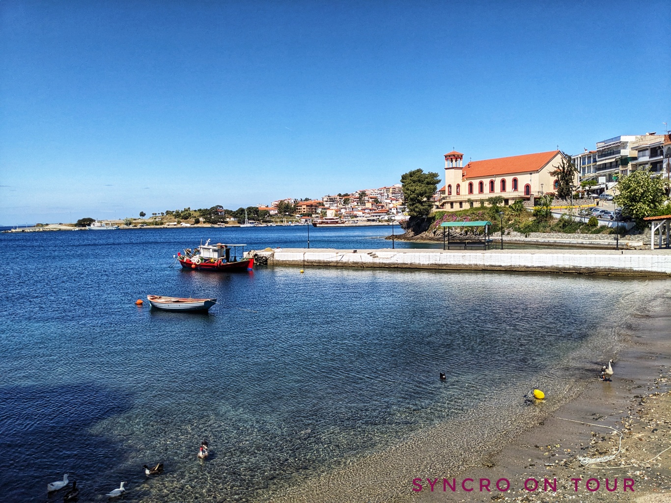 Wir sind fast alleine auf den Straßen und genießen die Reise. Wir machen unterwegs schöne Fotos und halten zum Kaffeetrinken im schon oben erwähnten Neu Marmara. Später fahren wir ins Landesinnere, was ja nie besonders weit vom Meer entfernt ist, zu einer sehr schönen orthodoxen Kirche. Wir können sie auch besichtigen. Die Kirche in Megali Panagia, die auch Panagiouda (heilige Mutter) genannt wird. Sie ist eine Pilgerstätte zu einer Ikone, die die Muttergottes zeigt, und die der Legende nach in einem Feld nahebei gefunden wurde, nachdem eine Frau dreimal davon geträumt hatte. Wir haben in der Nähe der Kirche jedenfalls eine sehr geruhsame Mittagspause gehalten.