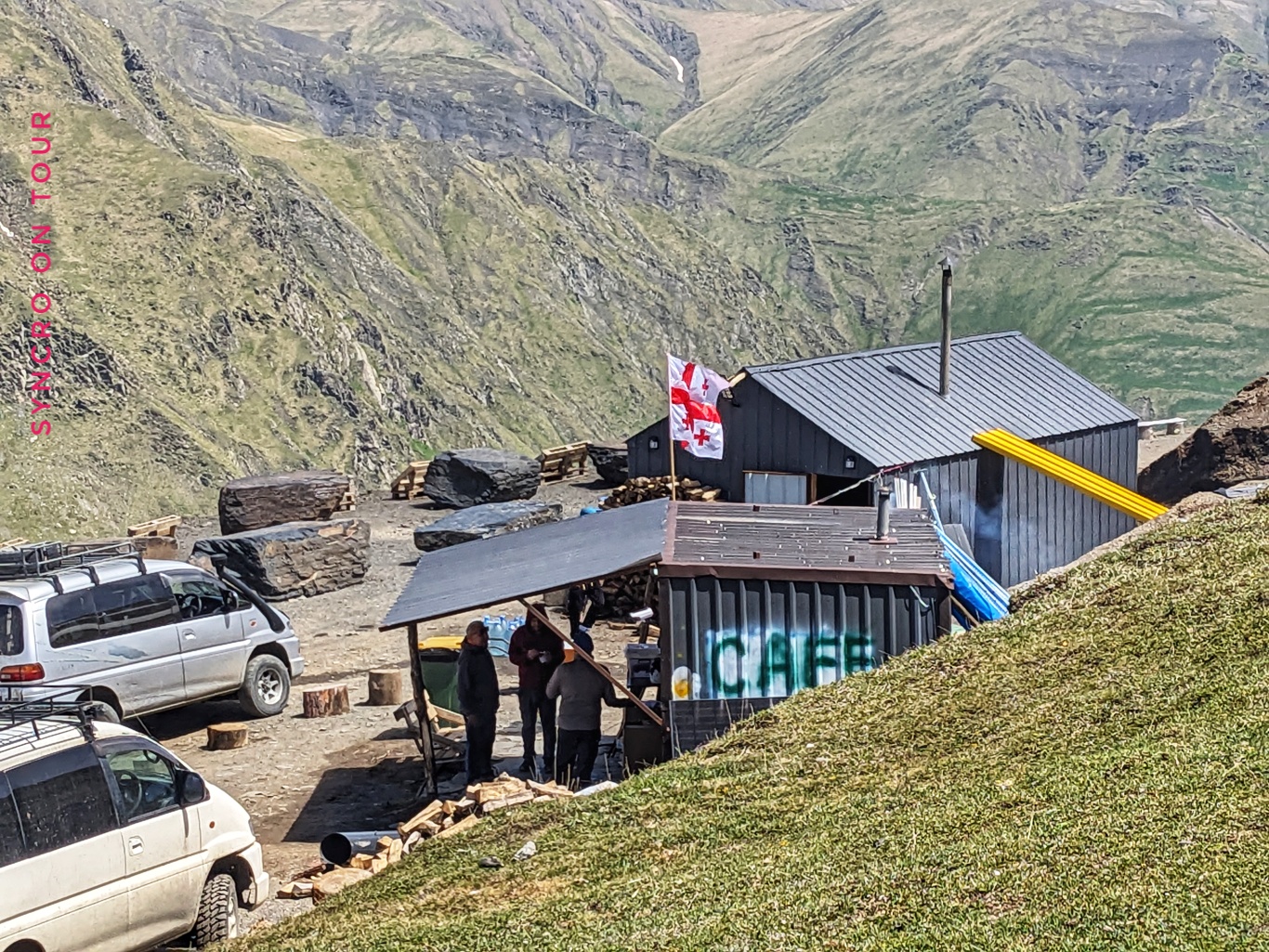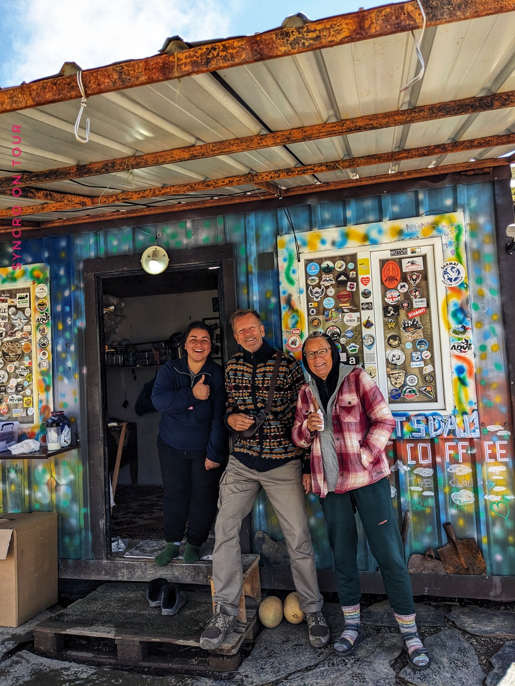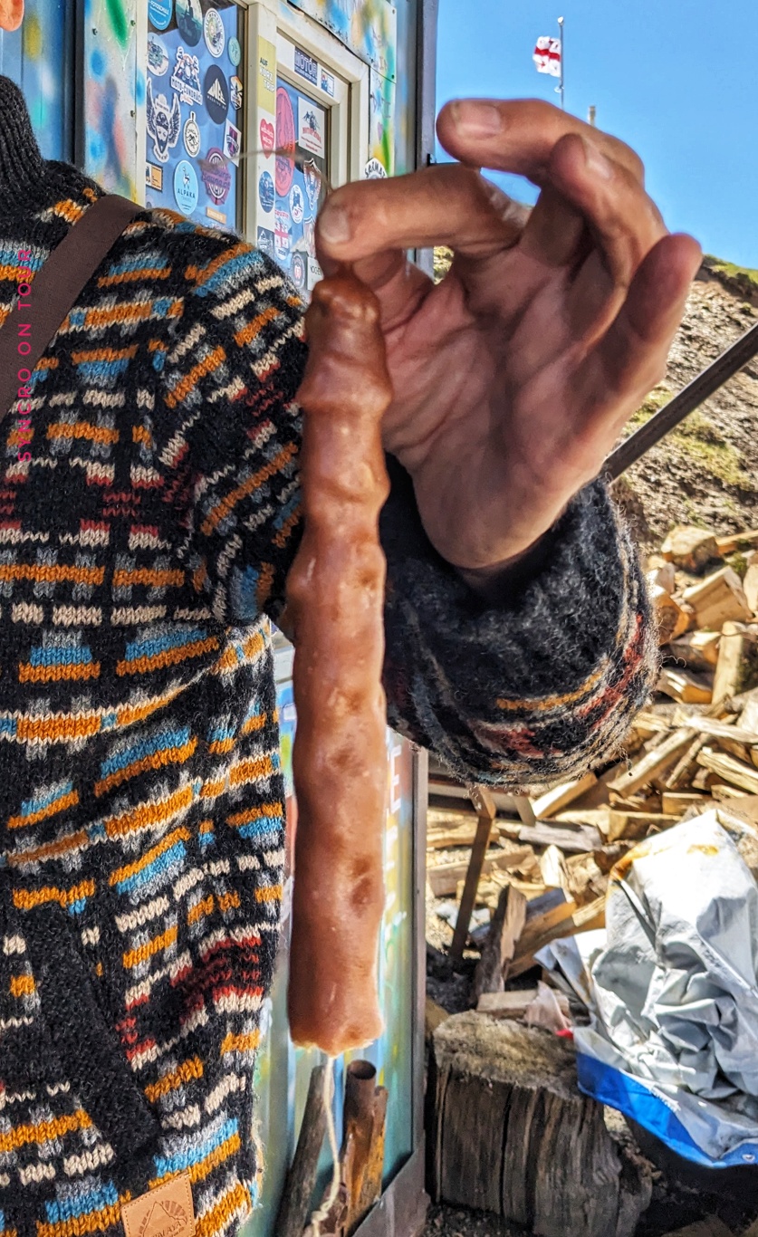 Oben auf dem Pass war es sehr kalt und Wolken zogen von unten nach oben über den Hang. Allerdings war die Stimmung prima. Es gab einen kleinen Kaffeeausschank, wo es auch Kuchen und die „georgischen Snickers“ gab, die ich endlich einmal probieren wollte. Sie heißen eigentlich Tschurtschchela und sind Nüsse, zB. Walnüsse, die auf einem Faden aufgefädelt mit Fruchtsaft überzogen zu einer festen Stange geformt werden. Sie sehen nicht besonders appetitlich aus, sie schmecken dafür aber sehr lecker. Wir kamen mit Dagi ins Gespräch, die die Kaffeebude vier Monate im Jahr ganz alleine managed und auch die Süßspeisen selbst herstellt.