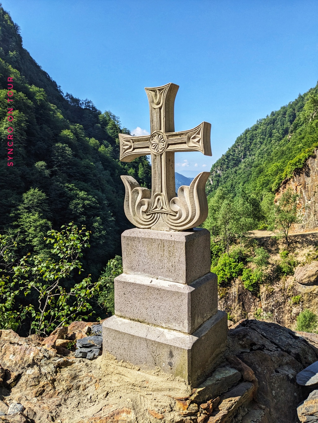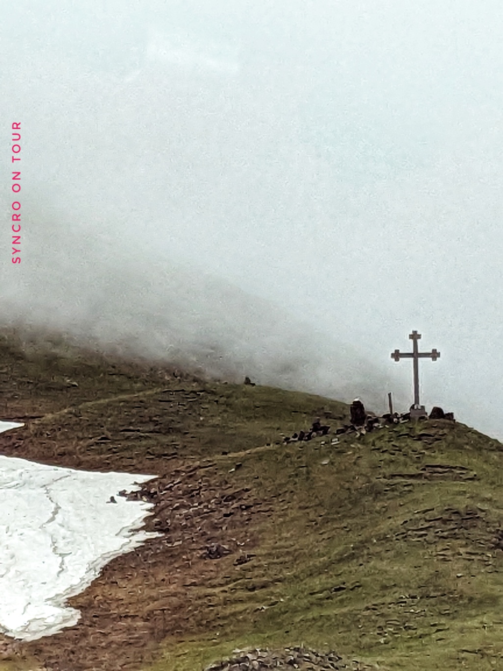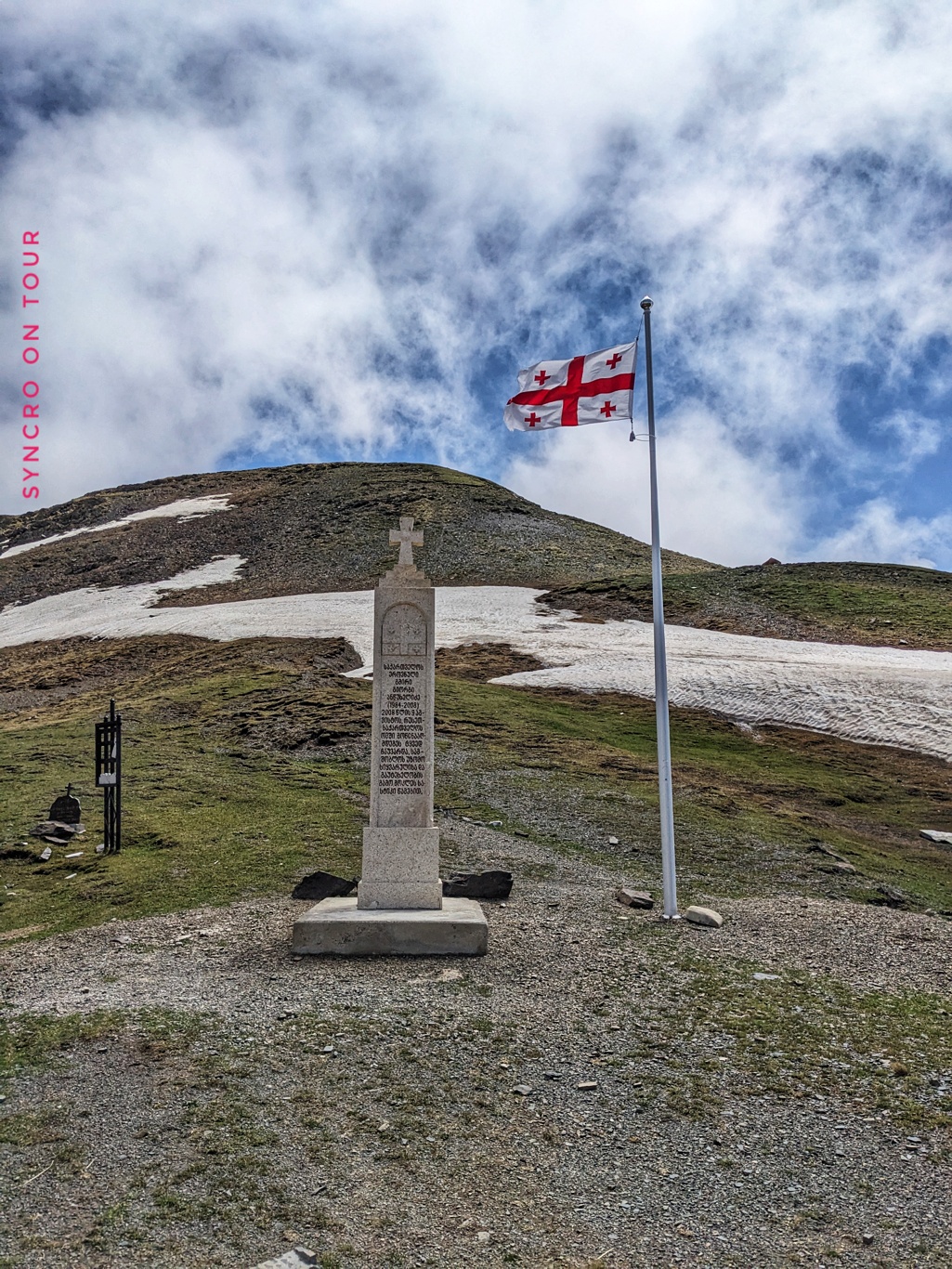 Oben auf dem Pass war es sehr kalt und Wolken zogen von unten nach oben über den Hang. Allerdings war die Stimmung prima. Es gab einen kleinen Kaffeeausschank, wo es auch Kuchen und die „georgischen Snickers“ gab, die ich endlich einmal probieren wollte. Sie heißen eigentlich Tschurtschchela und sind Nüsse, zB. Walnüsse, die auf einem Faden aufgefädelt mit Fruchtsaft überzogen zu einer festen Stange geformt werden. Sie sehen nicht besonders appetitlich aus, sie schmecken dafür aber sehr lecker. Wir kamen mit Dagi ins Gespräch, die die Kaffeebude vier Monate im Jahr ganz alleine managed und auch die Süßspeisen selbst herstellt.