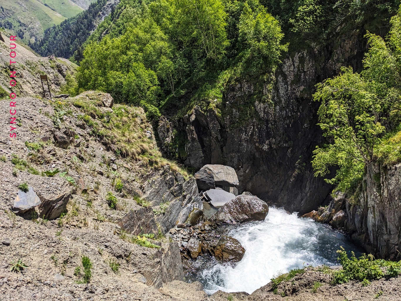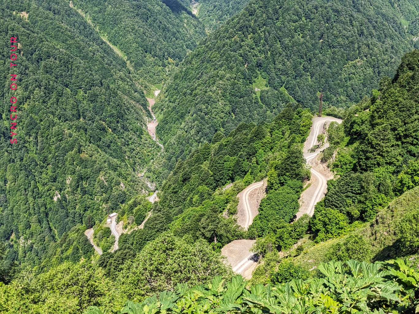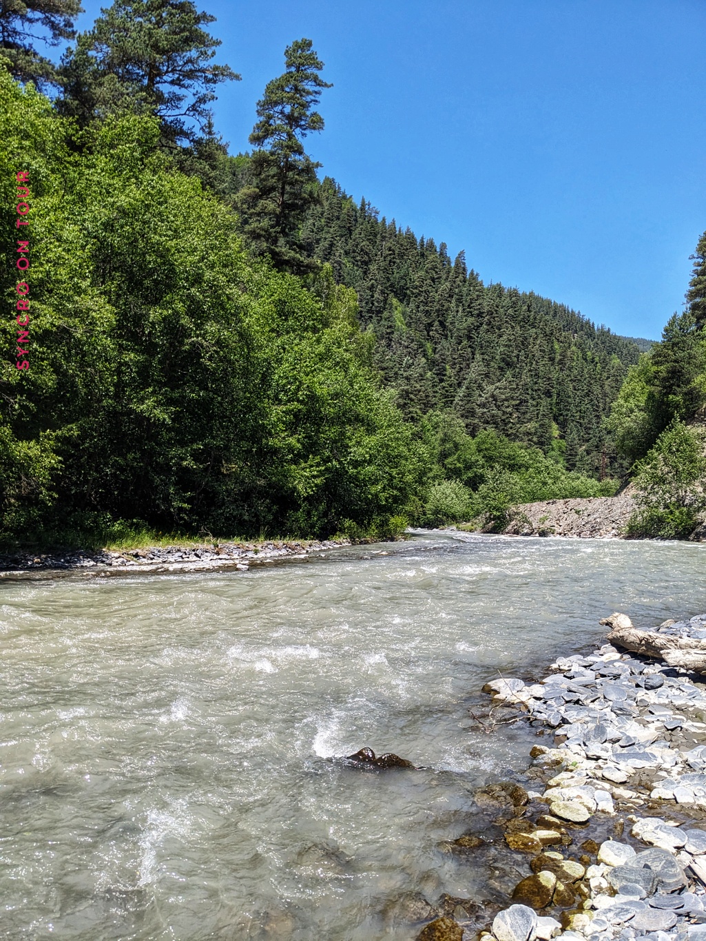 Auf der anderen Seite ging es wieder viele steile Serpentinen hinunter. Es ist die Nordseite des Gebirges, hier ist es kälter und es liegt noch mehr Schnee am Straßenrand. Wir winden uns mit der Straße immer weiter ins Tal. Hier gibt es viel Wald und einen reißenden Fluss. Die Landschaft erinnert an Filme aus Kanada oder Alaska. Wildromantisch nennt man das wohl.