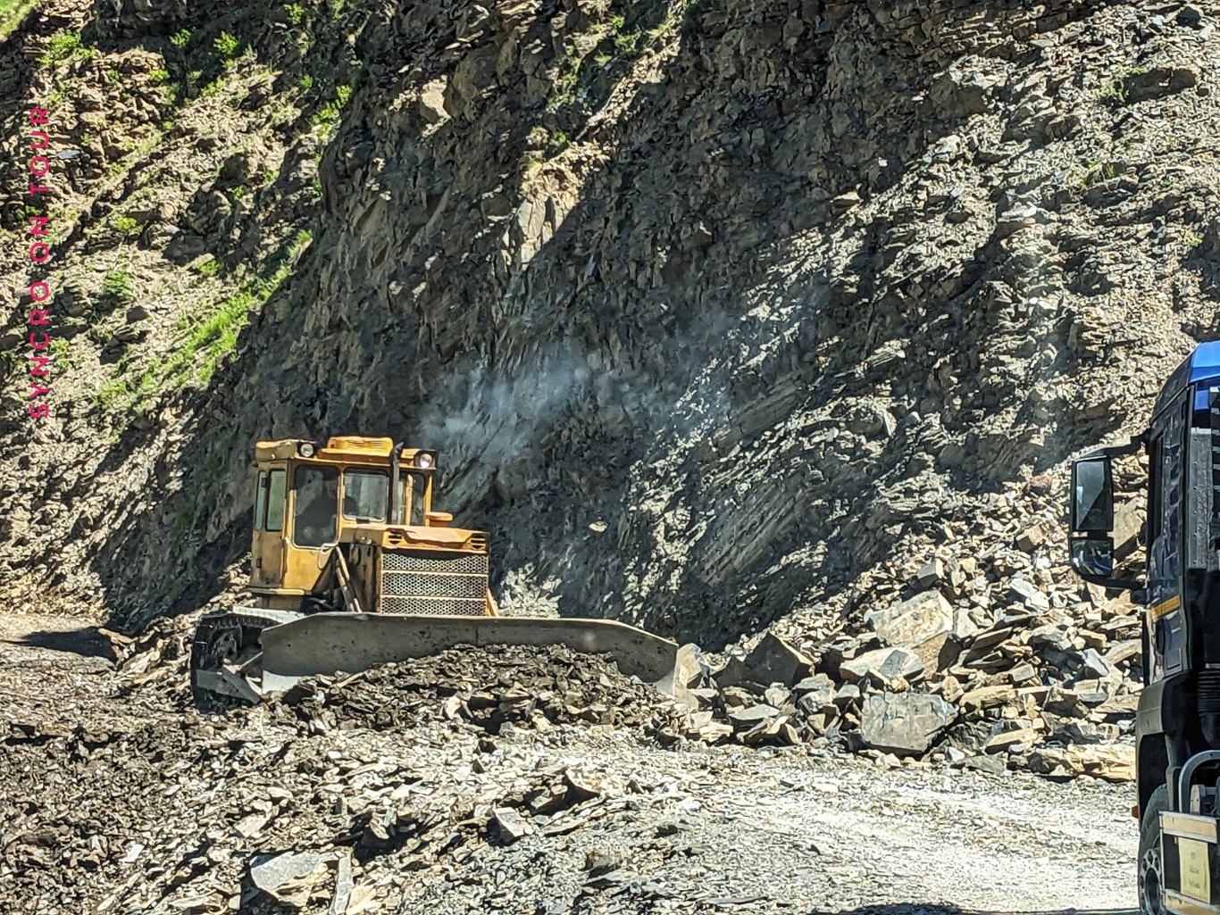 Wir sind extra früh aufgestanden, um die etwa dreistündige Fahrt zur Passhöhe früh in Angriff zu nehmen. Mit dem neuen Luftfilter lief der Bus wie am Schnürchen durch die Kurven und nahm die stetigen Steigungen ohne zu Murren und vor allem ohne den schwarzen Rauch der letzten Woche. Wir hatten wunderschönes Wetter, die Luft war frisch und klar. Unterwegs gab es nur wenig Störungen. Einmal musste der Bagger einen Erdrutsch der Nacht wegräumen.