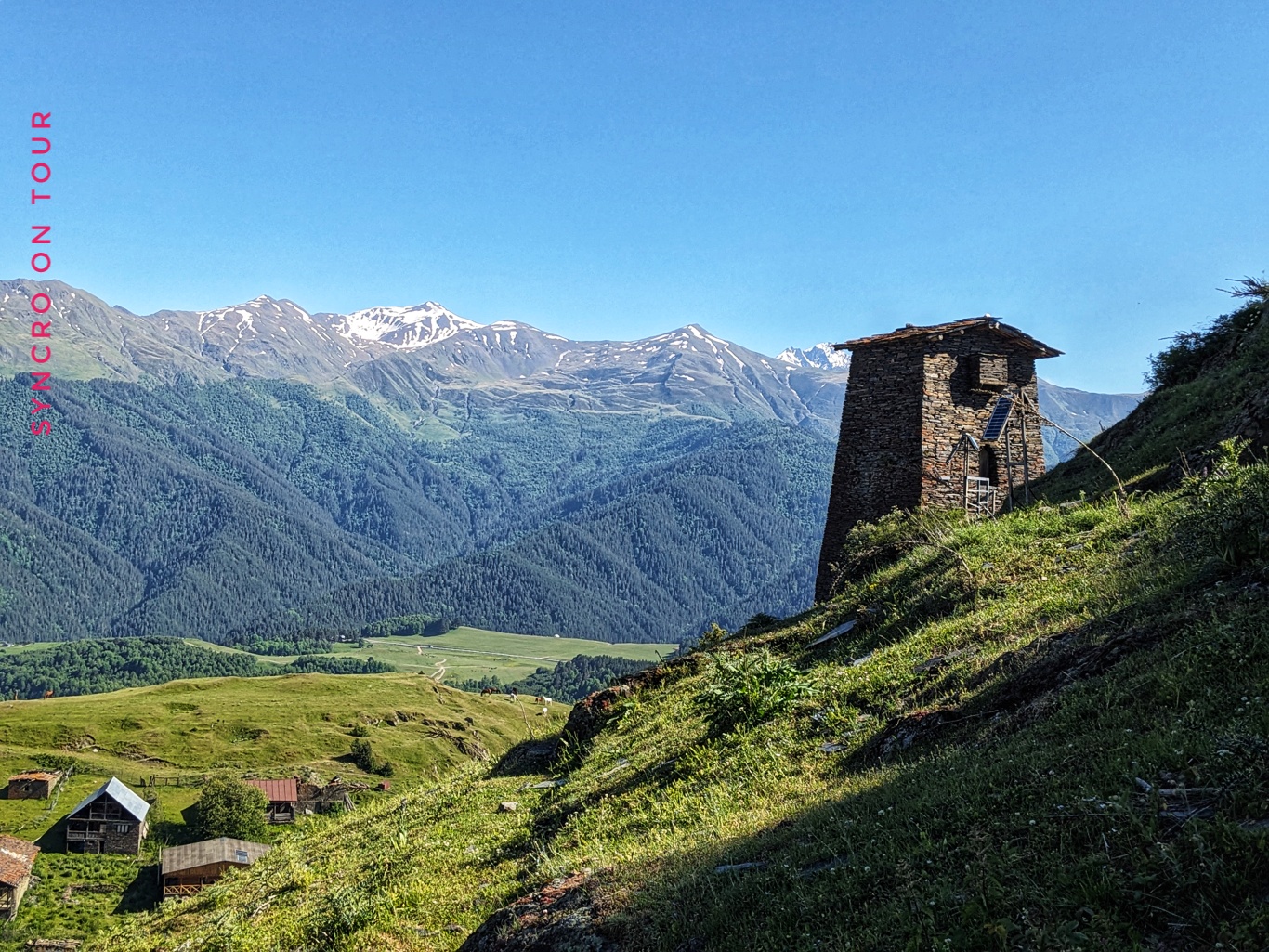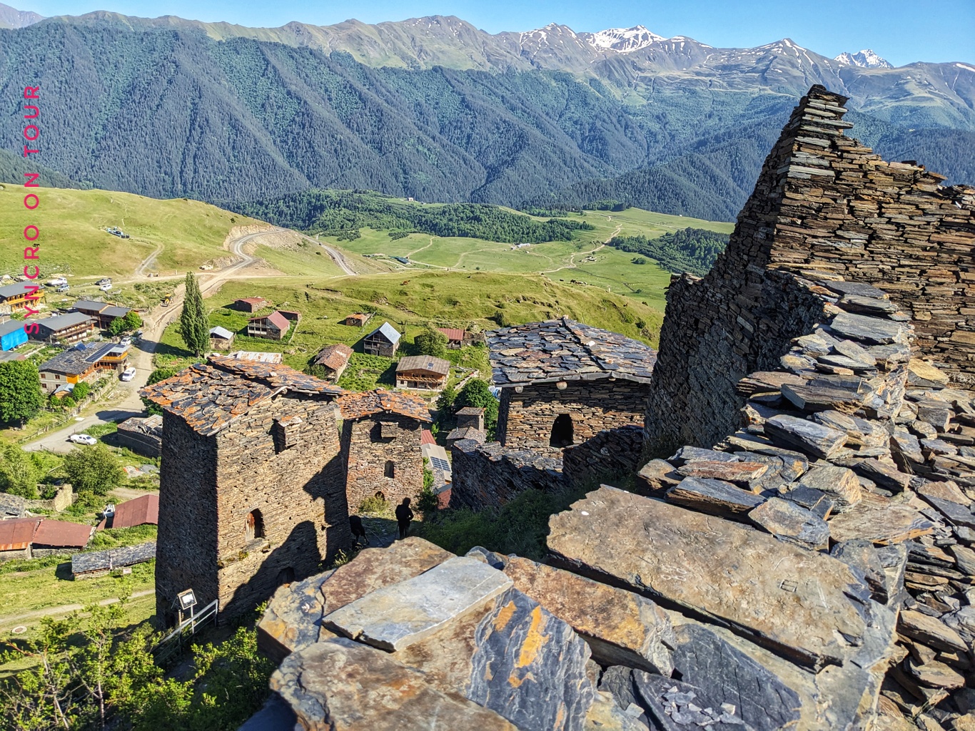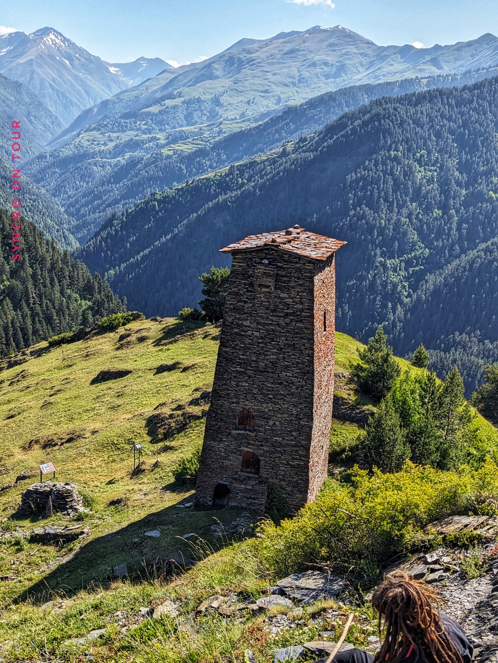 Nach einer schönen langen Mittagspause besuchten wir Upper-Omalo zu Fuß. Dort gibt es die für Tuschetien berühmten Wehrtürme, in denen jeweils bis zu fünf Familien wohnen konnten. Wir besuchten das schöne Ensemble von Türmen, von wo aus wir auch eine fantastische Aussicht auf die Berge und die Landschaft hatten.