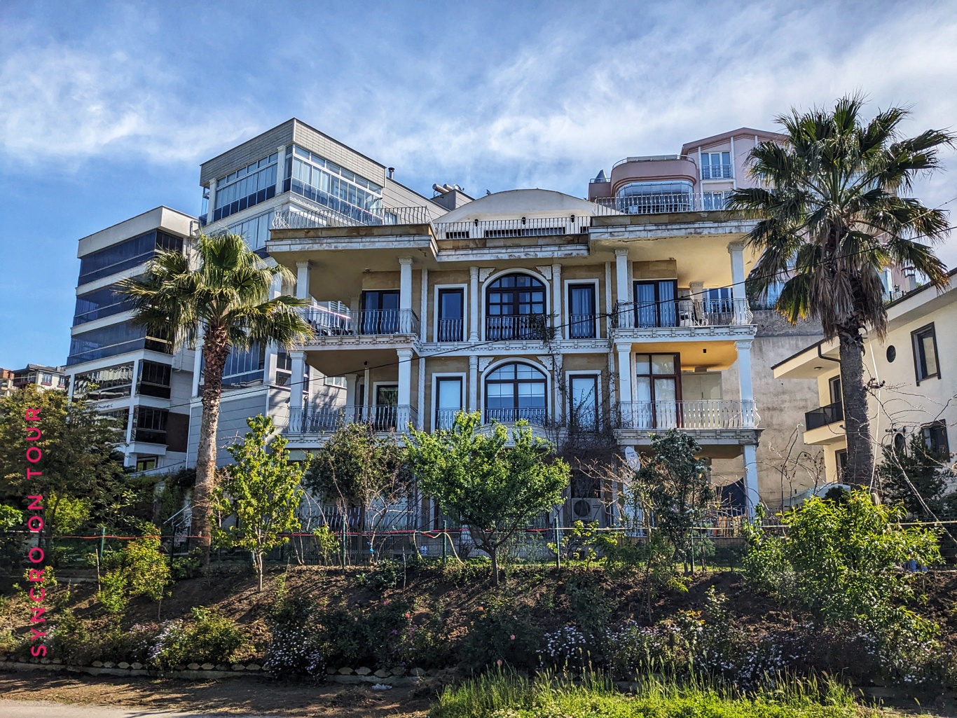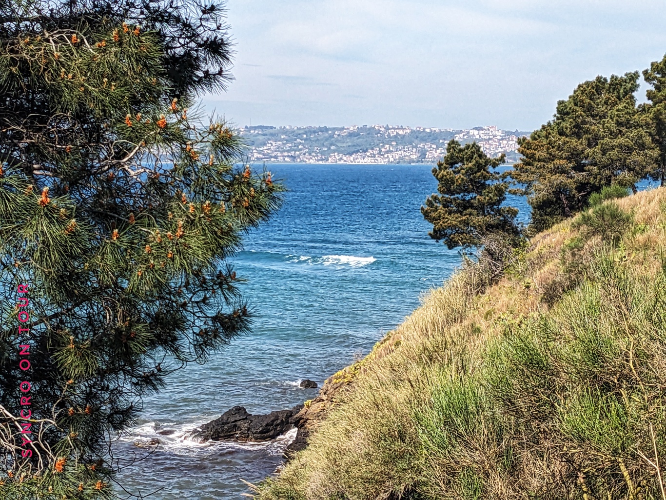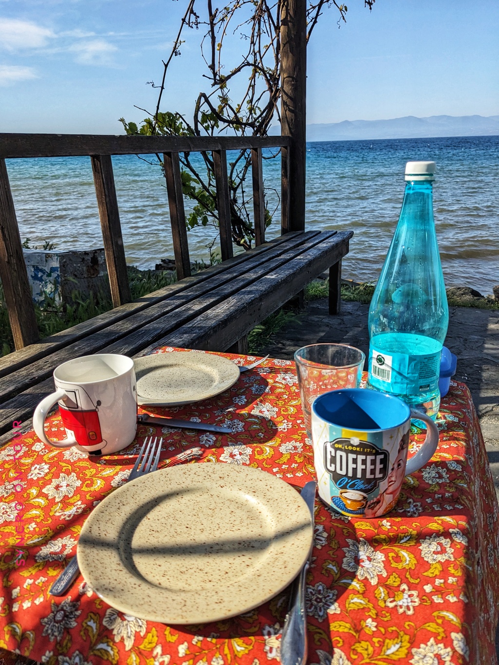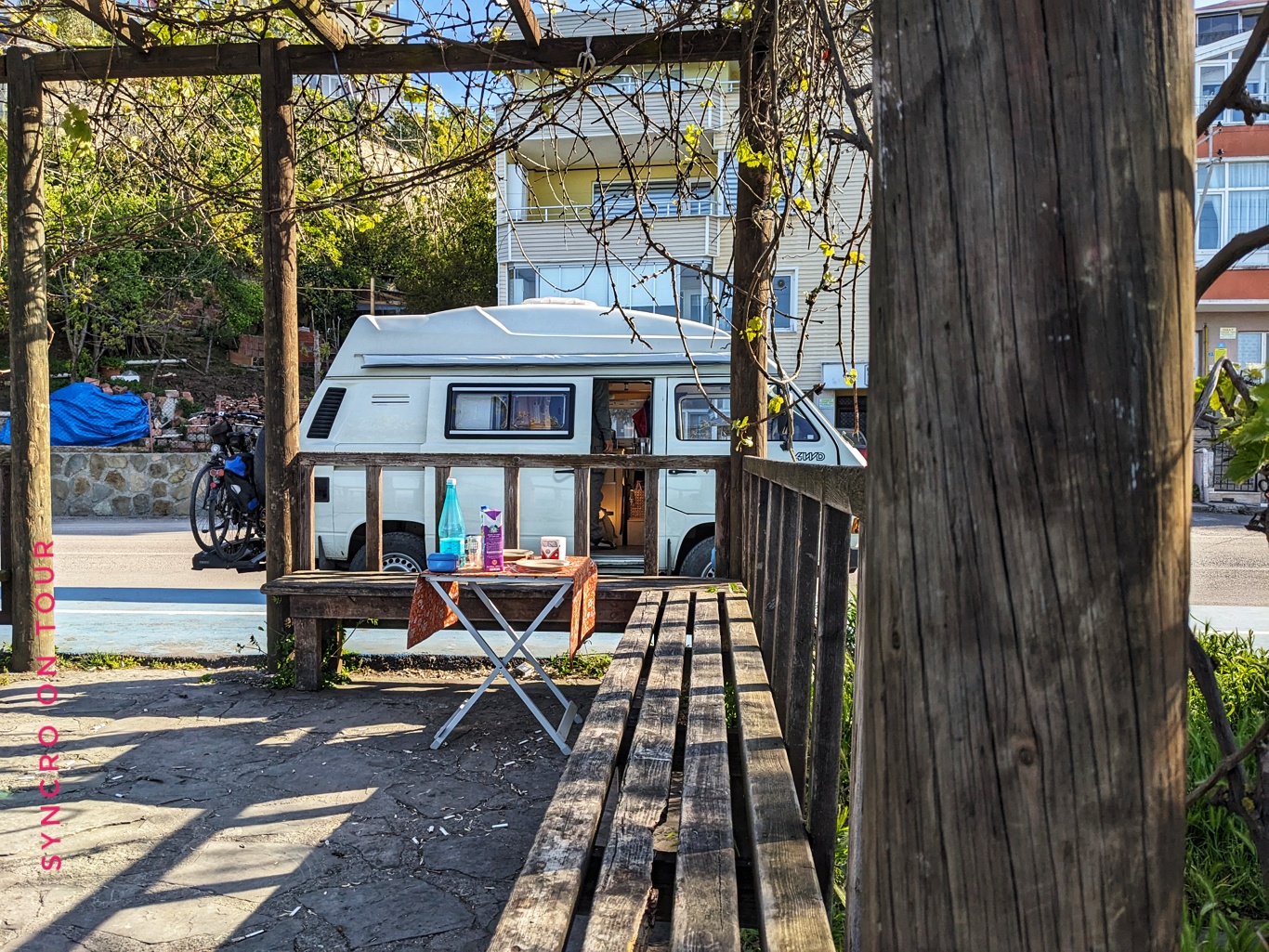 Soweit der Plan. Nach dem schönen Frühstück auf unserer „Privatterrasse“ direkt am Meer, haben wir einen langen Spaziergang auf der Promenade, die an unserem Auto vorbei um die Halbinsel von Sinop führt, gemacht. Das ging vorbei an tollen Villen, aber auch an kleinen lauschigen Plätzen am Meer, wo in Eigeninitiative mit ein paar Hölzern und alten Sesseln eine Platform unter den Kiefern direkt am Meer entstanden ist.