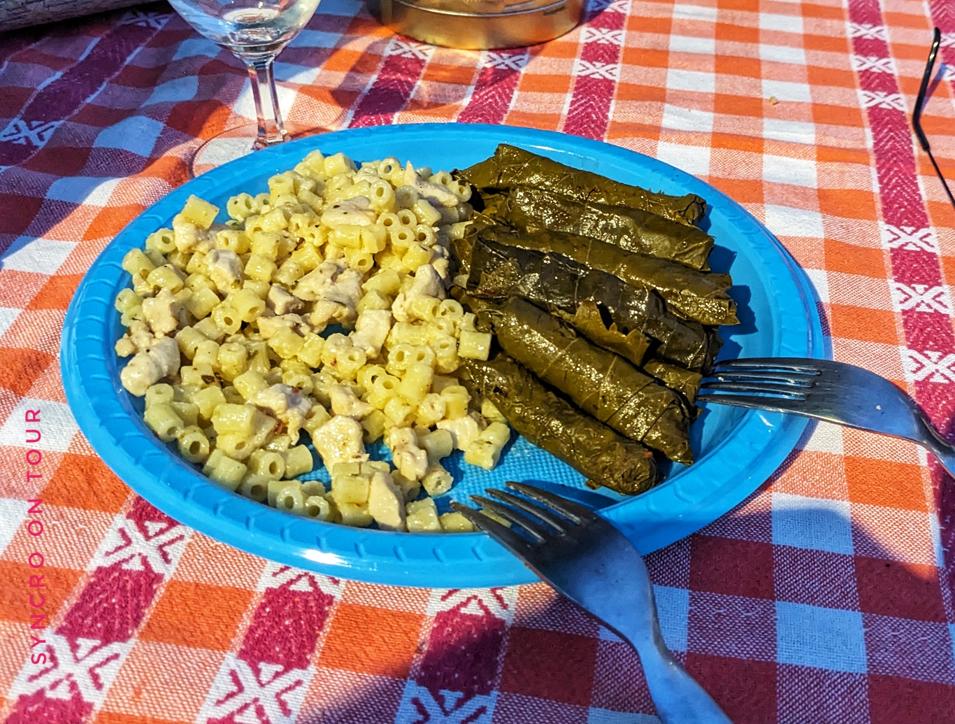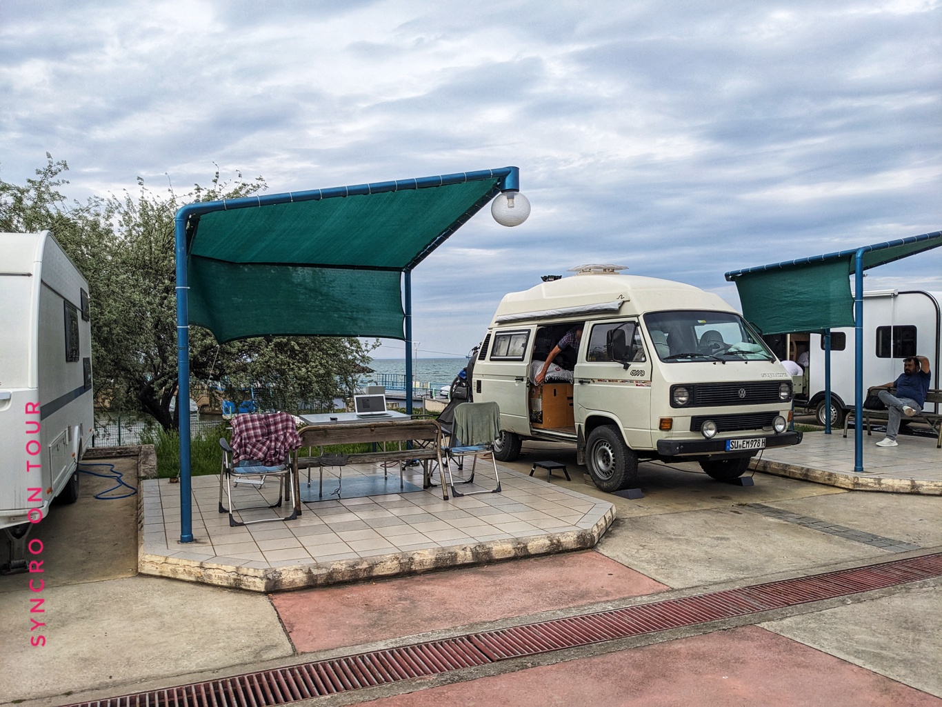 Auf dem Womostellplatz sammelten sich nach und nach unsere „Kollegen“ aus Deutschland, Russland, Österreich und der Türkei. Vom türkischen Nachbarn gab’s nach unserem Abendessen noch einen ganzen Teller mit Pasta und gefüllten Weinblättern. Abgesehen vom Dauerrauschen der Schnellbahntrasse und der Eisenbahn könnte das hier ein prima Platz werden.