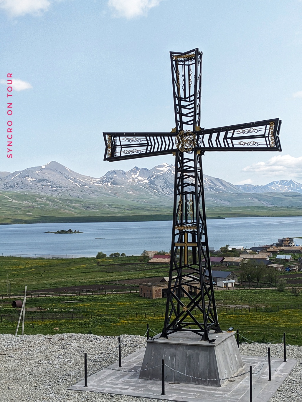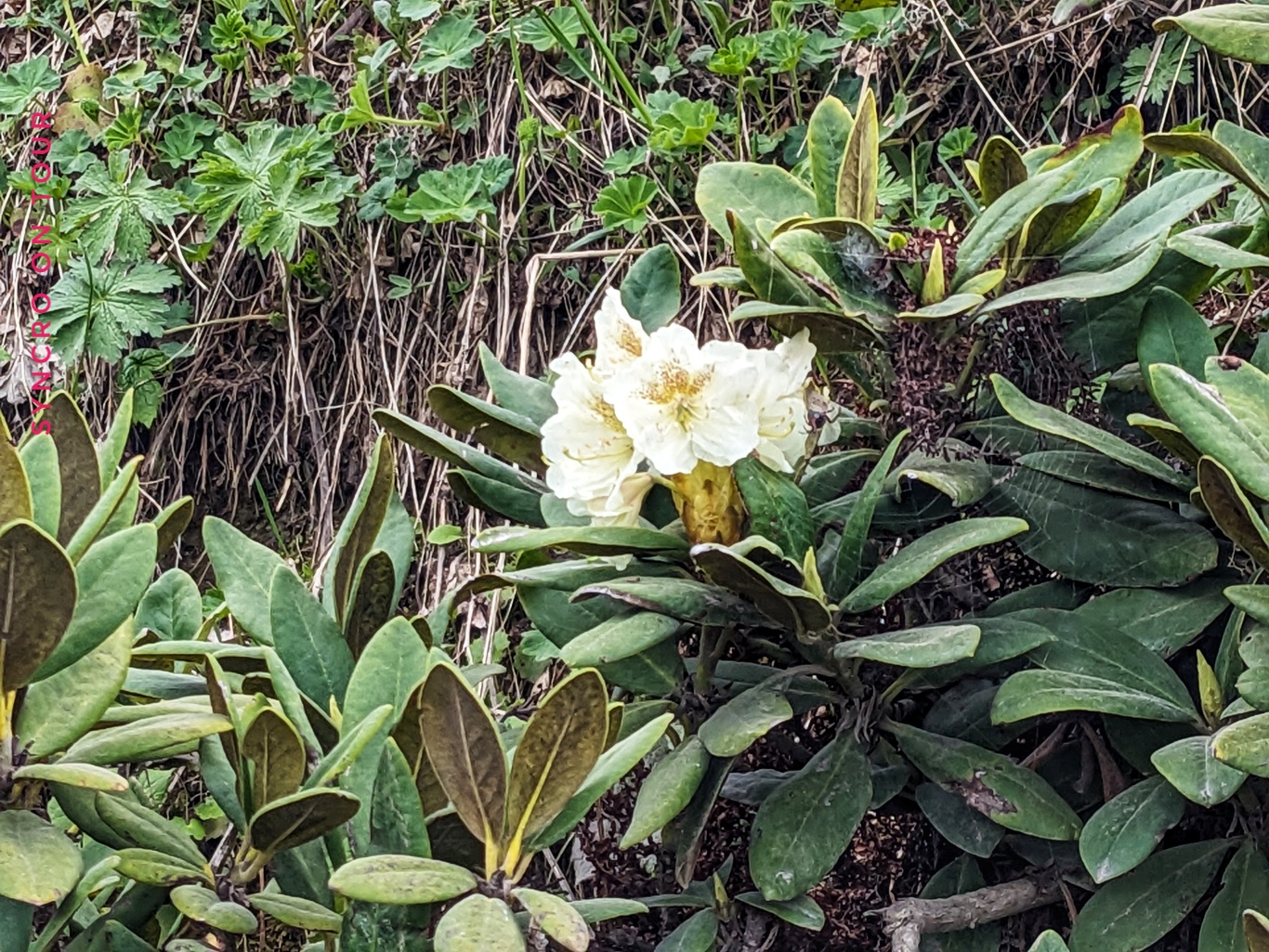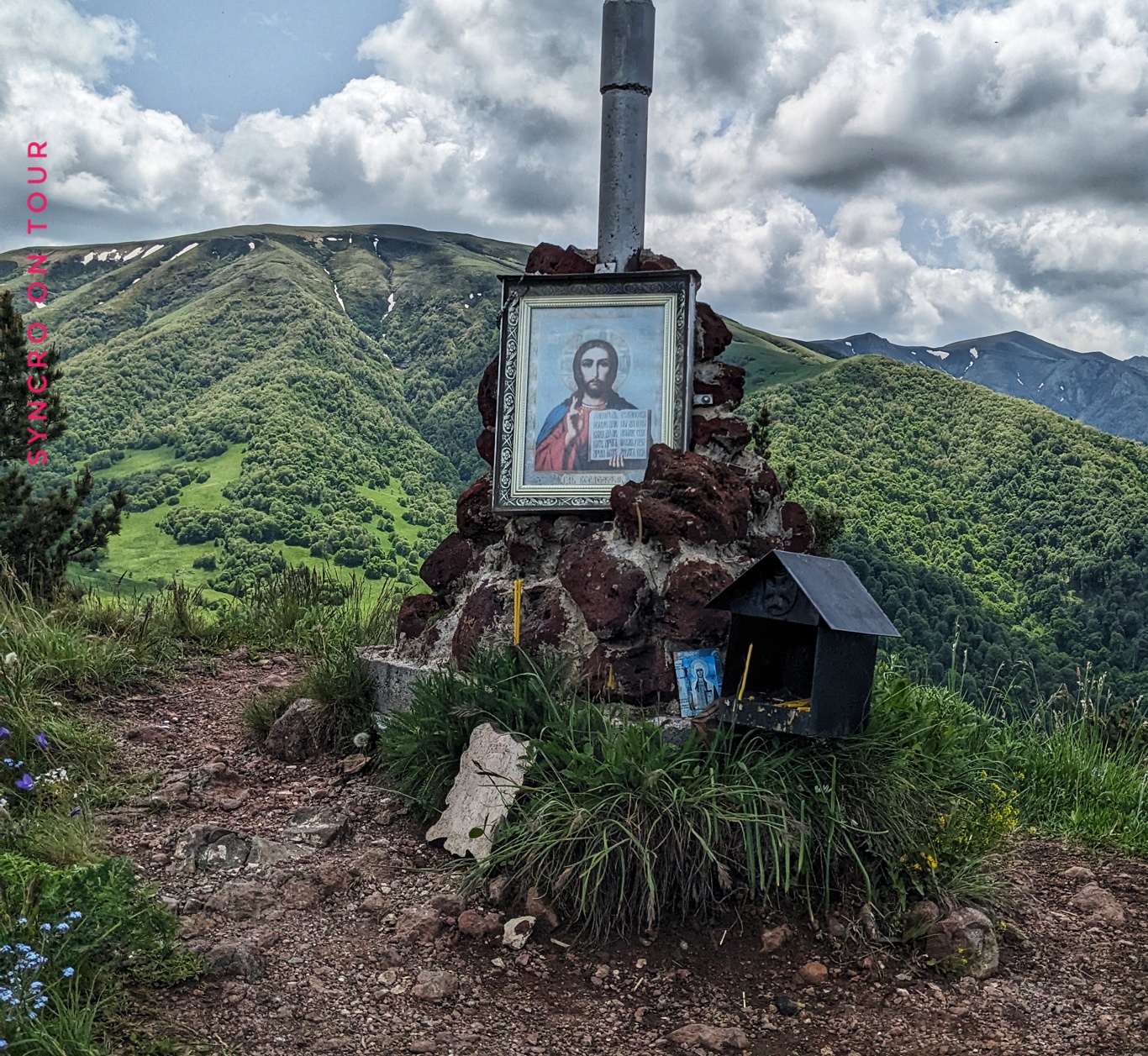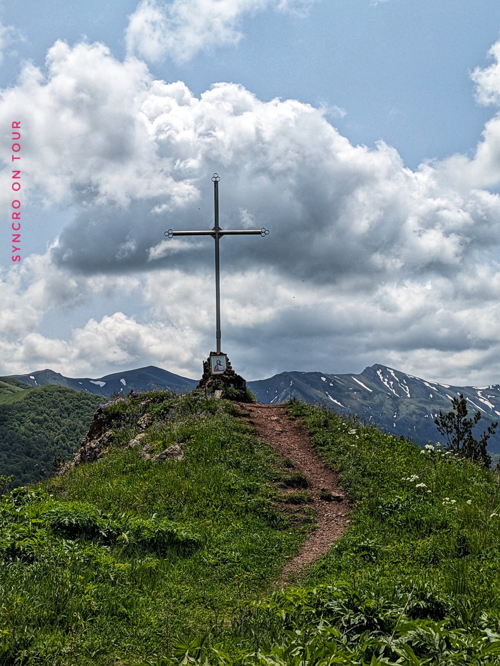 Nach Bakuriani wurde die Straße sehr schlecht. Sie führt auf den 2400 Meter hohen Tskhratskaro-Pass. Zwischendurch hielten wir einmal an einem Kreuz am Wegesrand, auch, um uns vom Staub der Lastwagen zu erholen, die uns ständig entgegen kamen. Natürlich war ich wieder von der Pflanzenwelt fasziniert. Hier gibt es ganze Hänge voller weißer Rhododendron.
