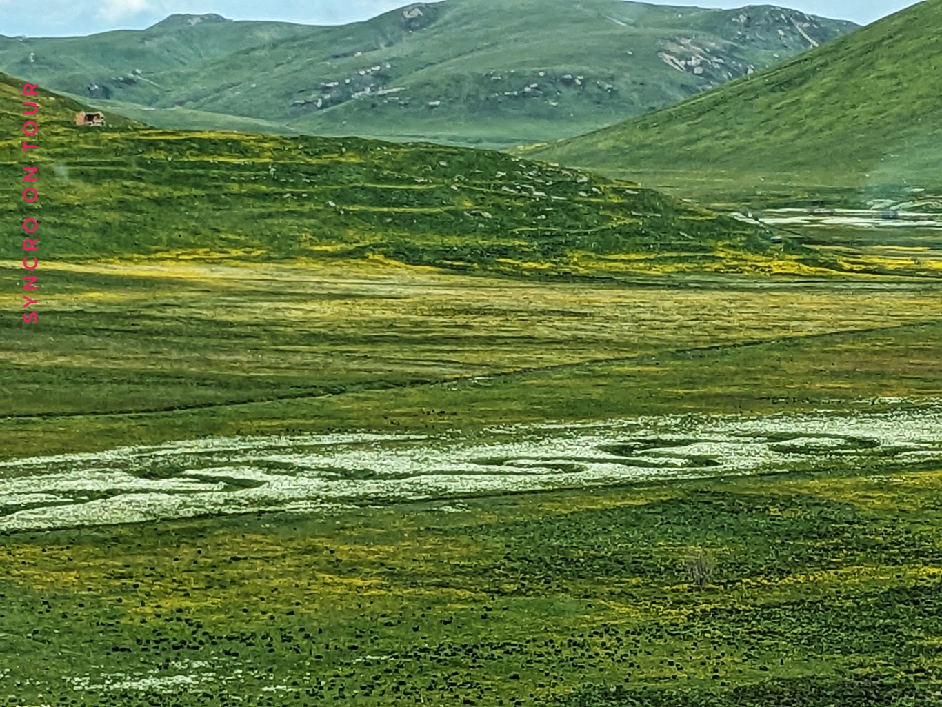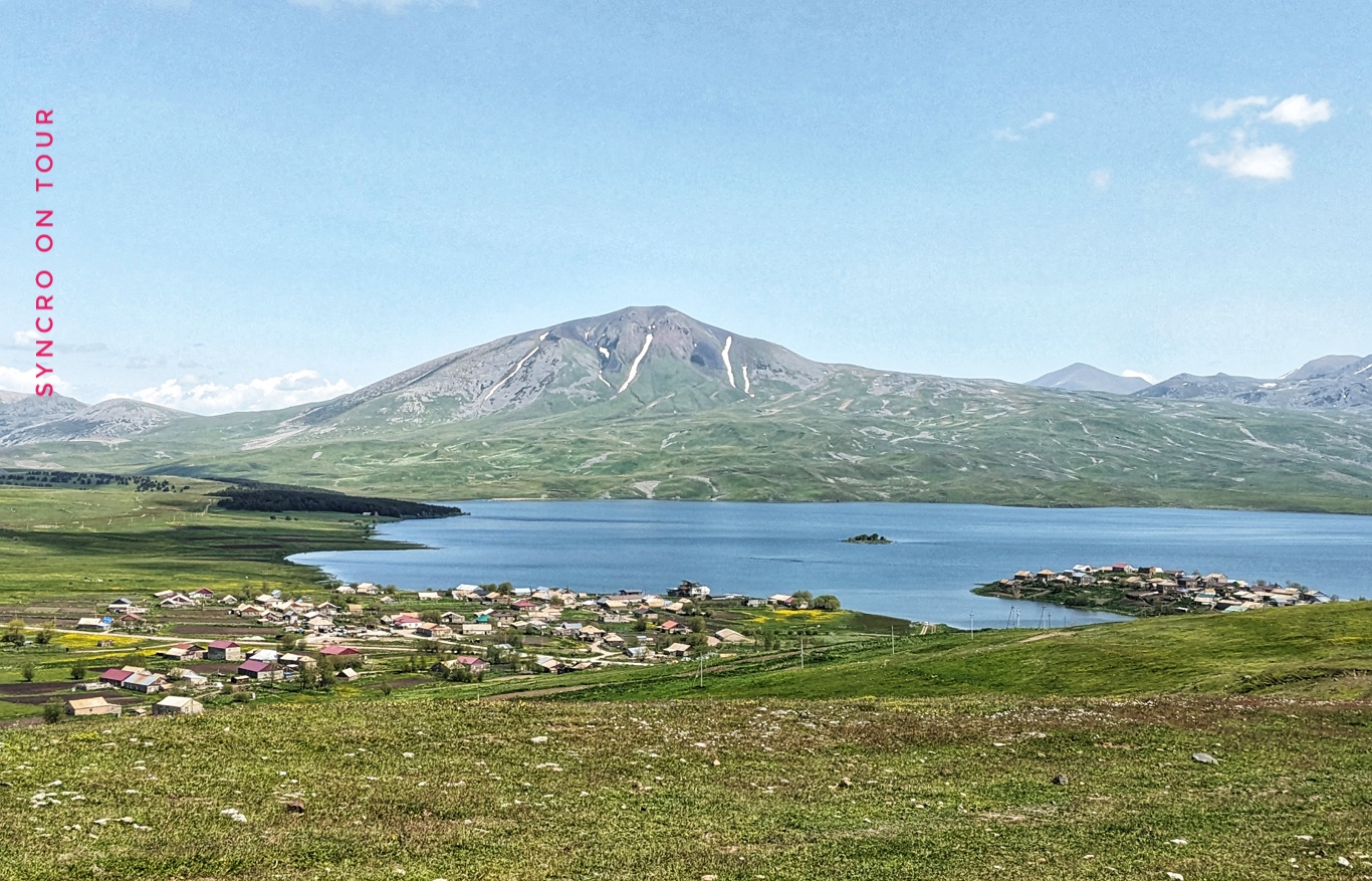 Danach ging es eine noch schlechtere Straße hinunter zum See und der kleinen Stadt Tabatskuri. Die grünen Hänge, die zuweilen mit bunten Blütenteppichen geschmückt sind, werden intensiv mit Schafen, Kühen und Ziegen beweidet. Auch gibt es hier viele Pferde. Anscheinend werden einige Herden von Eseln statt Hunden gehütet. Auf der Höhe vor Tabatskuri hielten wegen uns zwei vollbesetzte Autos mit Deutschen an. Sie gehörten zur European Monitoring Mission, zur Vermittlung zwischen den Konfliktparteien in Georgien. Vor allem beobachten sie die Grenzen innerhalb Georgiens zu Abchasien und Süd-Ossetien. Sie hatten zwei Tage frei und machten einen Ausflug. Ihnen gefiel unser Bus.