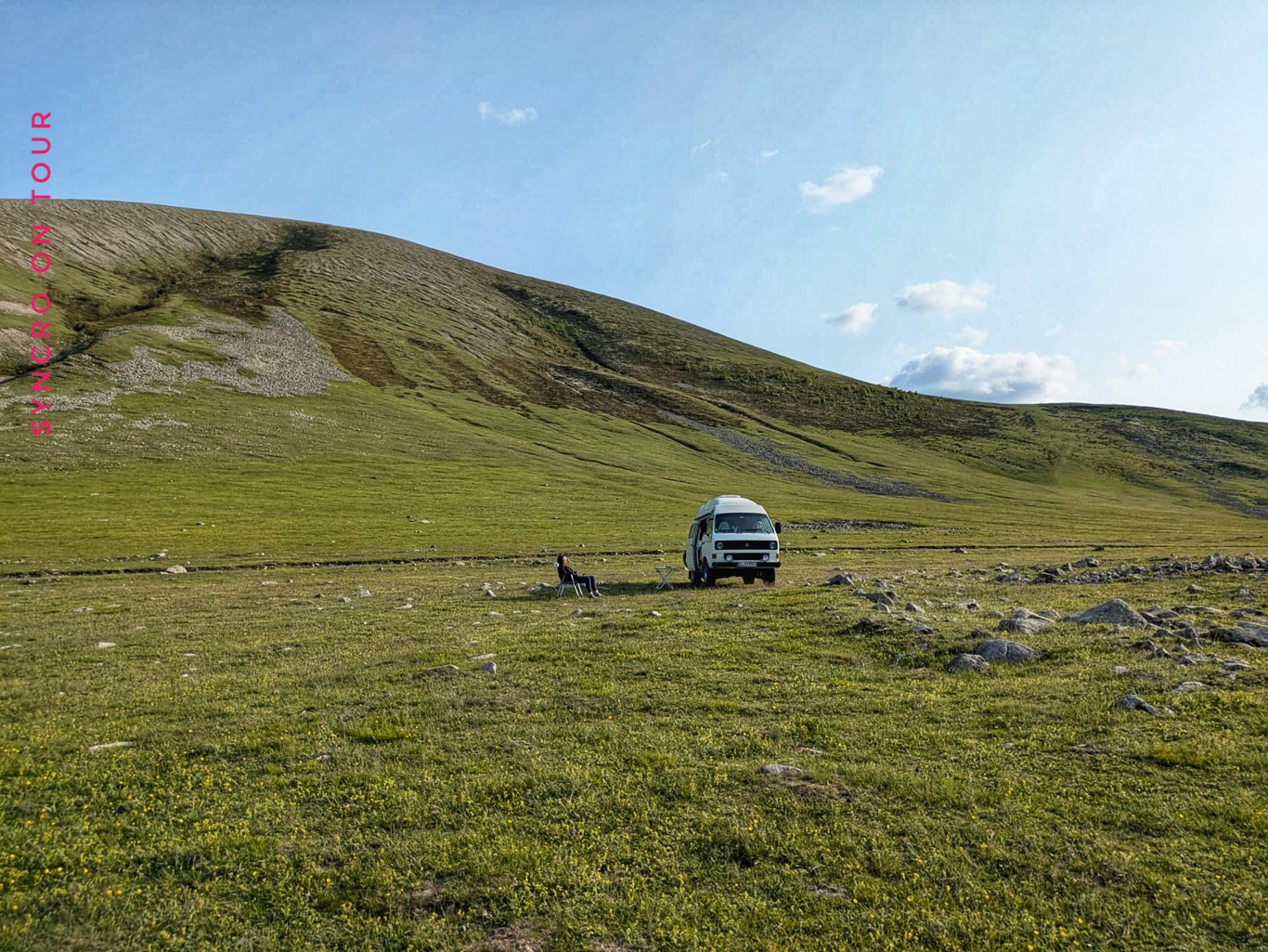 Gegen 18 Uhr hatten wir genug von der rumpeligen Piste. Wir schlugen auf einer Kuppe unser Nachtlager auf. Von hier haben wir eine prima Sicht ins Tal und auf den See, den wir morgen besuchen werden.