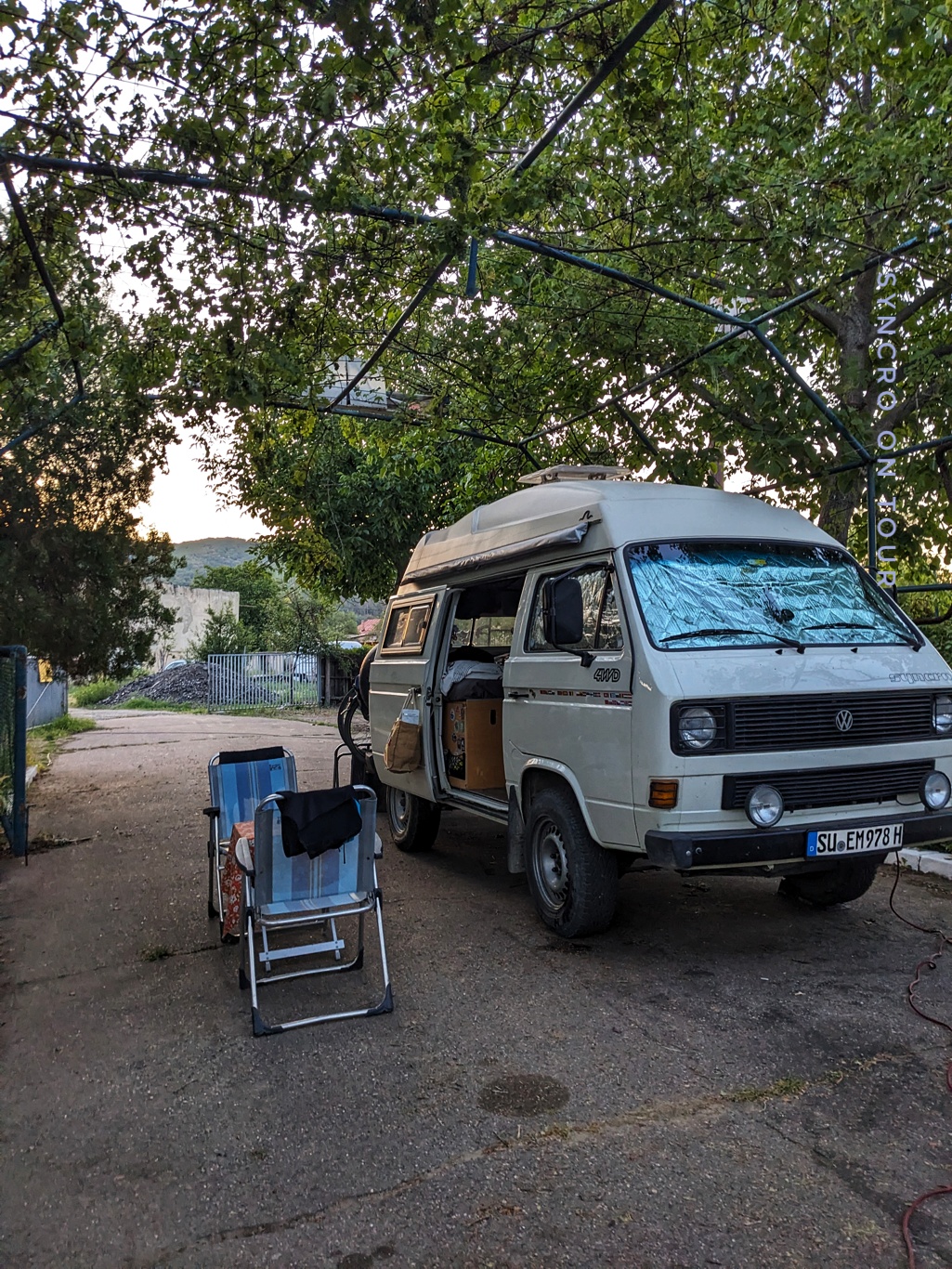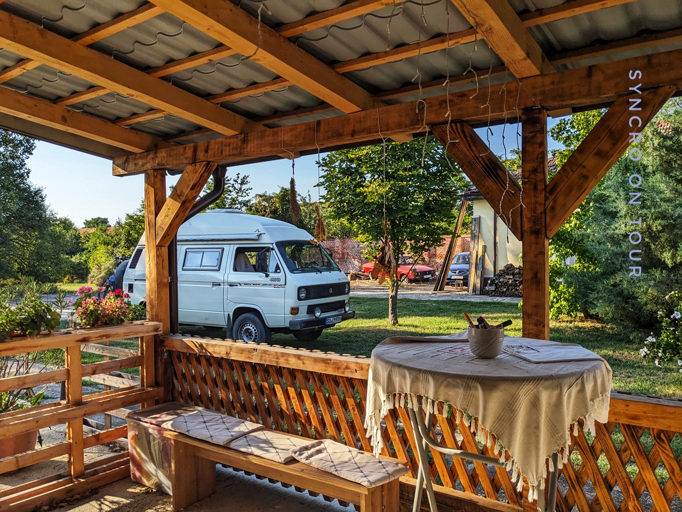 Die Nacht auf dem kleinen Campingplatz in Balotesti war genauso unruhig wie der ganze Abend. Obwohl uns der Betreiber des Platzes versprochen hatte, dass wir hinter seinem Tor ungestört wären, wurden wir nachts um zwei sehr unsanft geweckt. Ein Partygast musste mit seinem Auto samt Anhänger bei uns vorbei, um das Grill-Equipment abzuholen. Er war ziemlich betrunken – wir waren nicht gewillt, unser Lager zu räumen. Michael half ihm, unter unserer Markise durchzufahren.