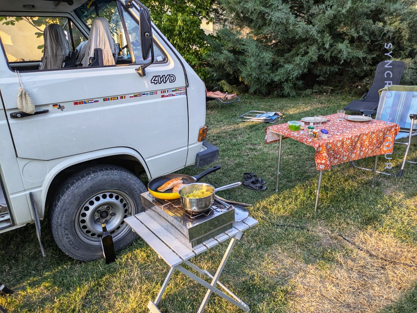 Wir hielten auf einem schattigen Seitenstreifen in einem der letzten Waldgebiete, bevor es hinunter in die endlose Ebene vor und hinter Timișoara (Temeschwar) ging. Wir sind erst gegen 16:30 Uhr weitergefahren, aber die Temperatur stieg immer noch. Gegen 19 Uhr hatten wir immer noch fast 40 Grad draußen, ganz zu schweigen von der Hitze im Auto.