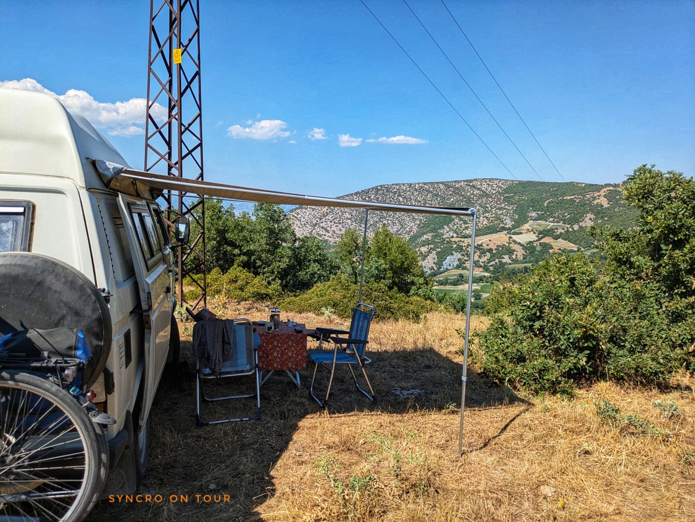 Die heißeste Zeit des Tages verbrachten wir im angrenzenden Nationalpark auf einer Anhöhe zwischen kratzigen Sträuchern. Wir hatten Schatten unter unserer Markise und ab und zu kam ein kühler Luftzug aus den Bergen.