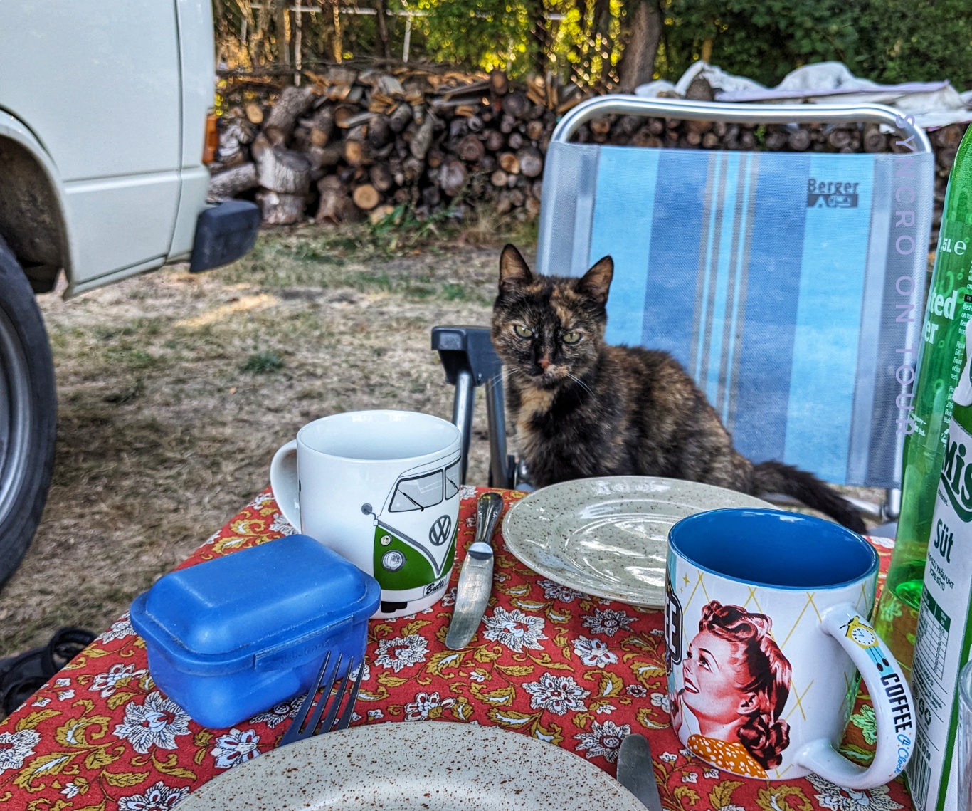Die Nacht auf dem MotoCamp Bulgarien war sehr erholsam. Wir haben beide sehr gut geschlafen. Ich habe sogar den Hahn nicht gehört, der eine Stunde am Morgen gekräht haben soll. Zum Frühstück hatten wir Besuch von der Katze.