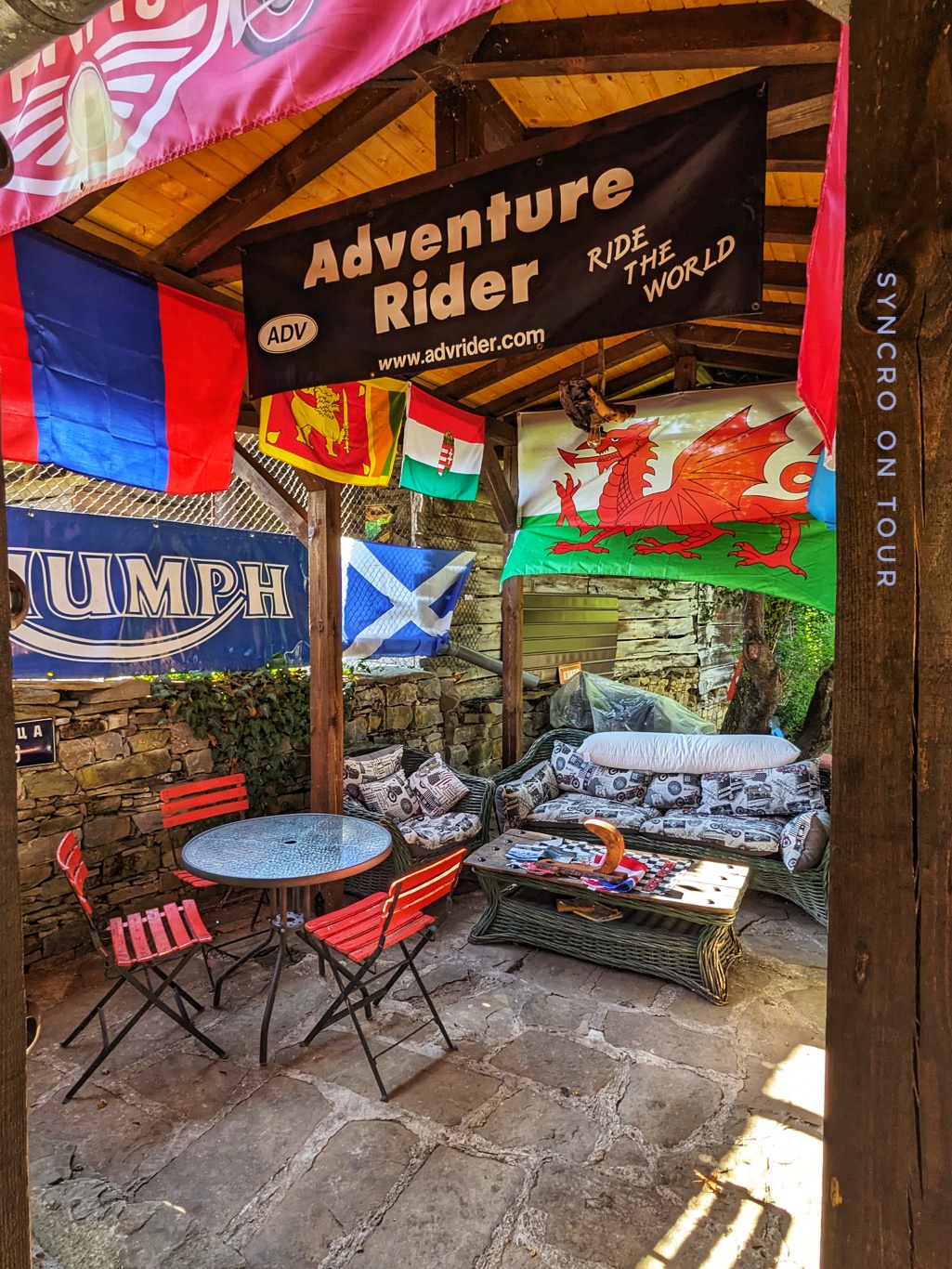 Wir haben uns noch einmal genauer im Camp umgeschaut und uns an der liebevollen, auf Biker zugeschnittenen, Ausstattung erfreut. Ivo ist ein echter Motorradfan und tut alles, um seine Gäste glücklich zu machen. Nachdem ich ihm gestern von Davids kleinem Bauernhof in Texas erzählt hatte, trafen wir ihn heute Morgen ganz zufällig mit einem passenden T-Shirt. Sein Camp möchten wir gerne allen Bikern empfehlen, die durch Bulgarien reisen. Hier der Link