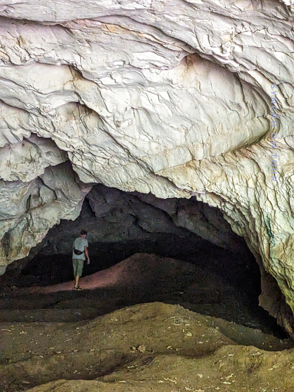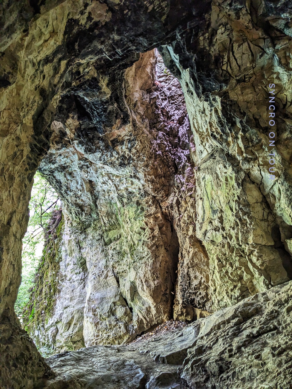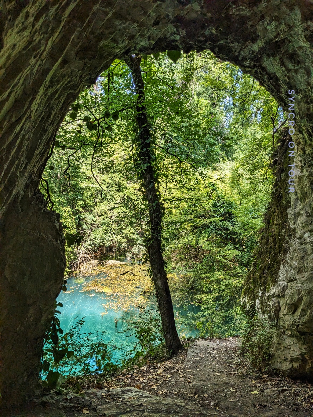 Unterwegs war es Zeit für unser Mittagessen und eine kleine Pause. Wie durch Zufall fanden wir einen ganz besonderen Platz. Vom eher hässlichen Parkplatz führte ein Pfad bergab zu einem verwunschenen smaragdgrünen Teich oder gestauten Bach. Nach ein paar Metern standen wir vor einer Höhle. Erst sah es so aus, als ob es hier nicht weiterging, aber dann haben wir uns in die schmale Öffnung gezwängt und mithilfe der Handys Licht gemacht. Die Höhle war eher ein verwinkelter Tunnel auf die andere Seite des Bergs, wo wir wieder am Wasser herauskamen. Eine schöne, erfrischende Unterbrechung der Fahrt.