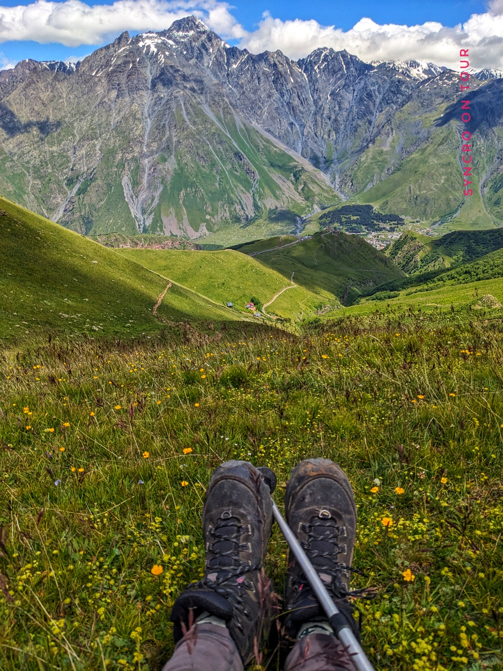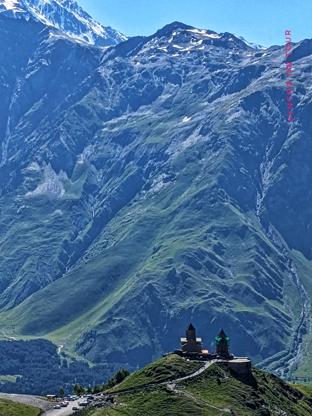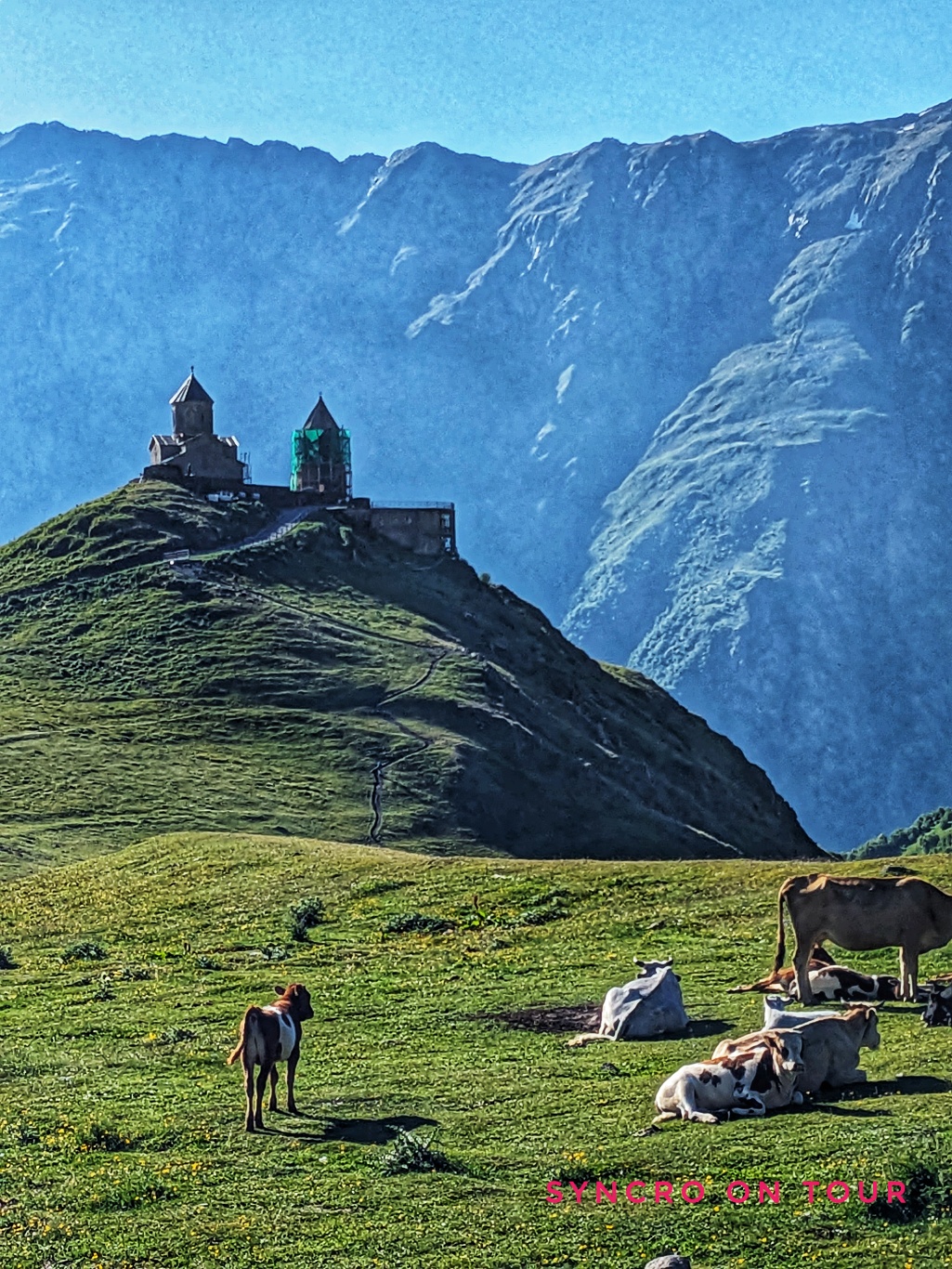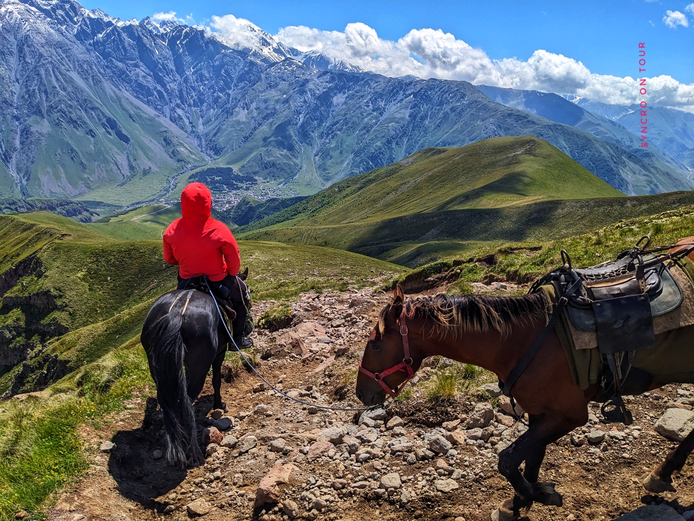 Wir waren sehr stolz auf uns, dass wir diese Bergtour geschafft haben. Wieder zurück am Bus bekamen wir dann auch das Foto von der Dreifaltigkeitskirche von Gergeti hin, obwohl sich die Wolken hinter uns immer dunkler auftürmten. Die Aussicht auf die andere Talseite hielt sich noch eine ganze Weile.