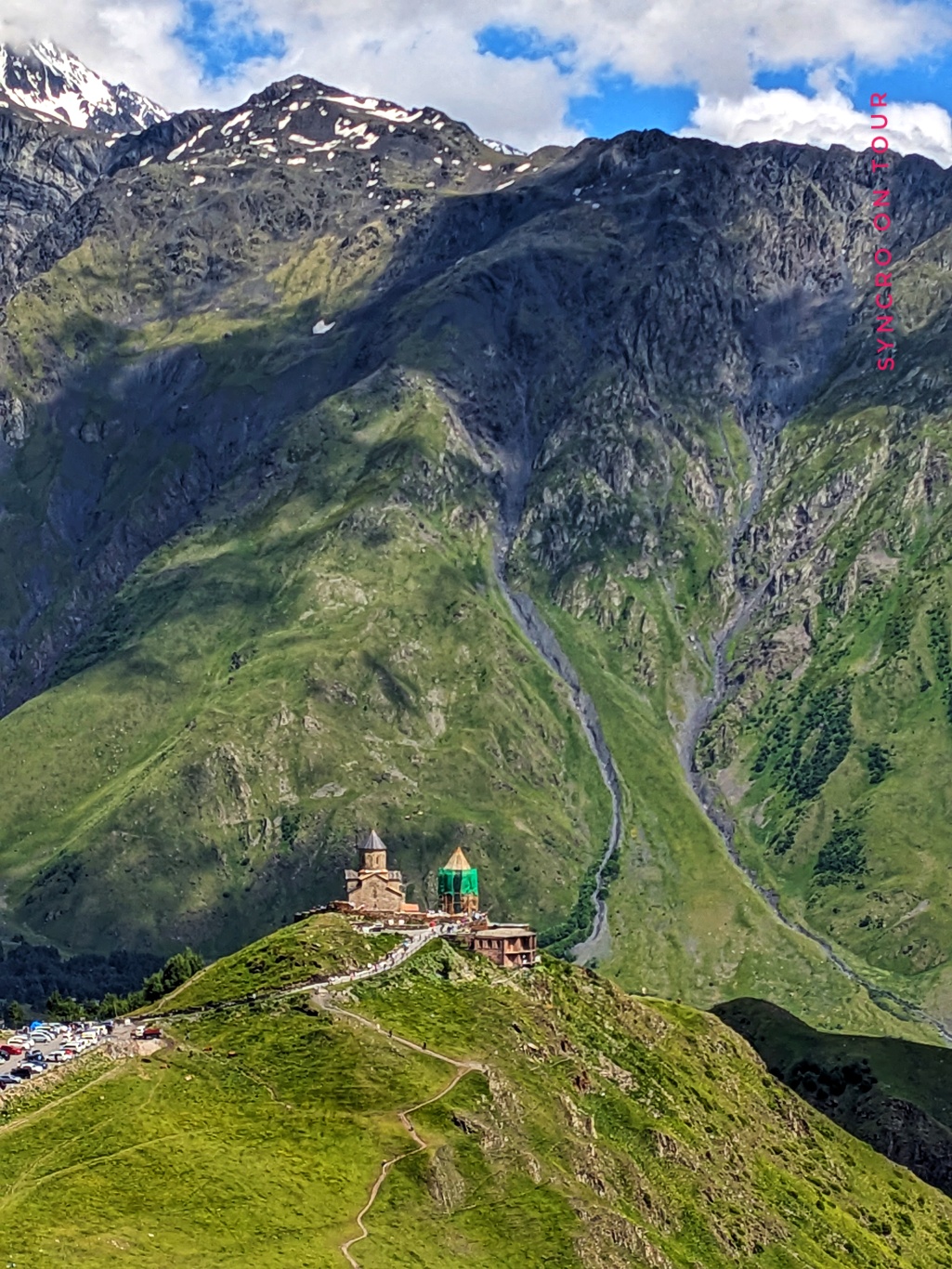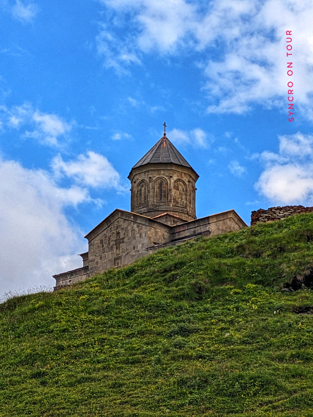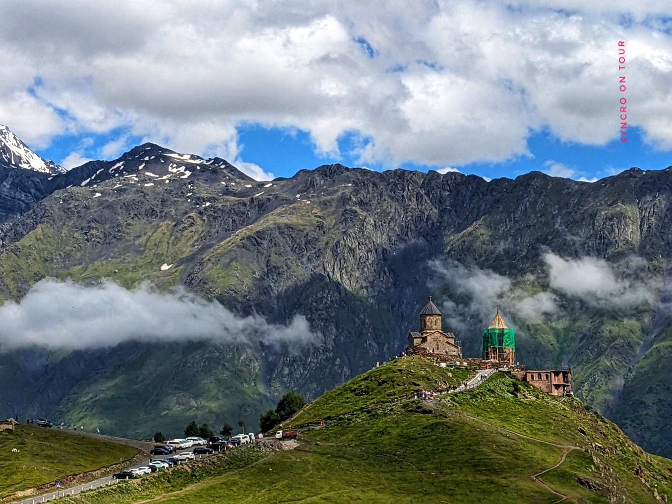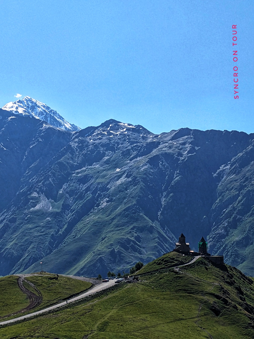 Wir waren sehr stolz auf uns, dass wir diese Bergtour geschafft haben. Wieder zurück am Bus bekamen wir dann auch das Foto von der Dreifaltigkeitskirche von Gergeti hin, obwohl sich die Wolken hinter uns immer dunkler auftürmten. Die Aussicht auf die andere Talseite hielt sich noch eine ganze Weile.