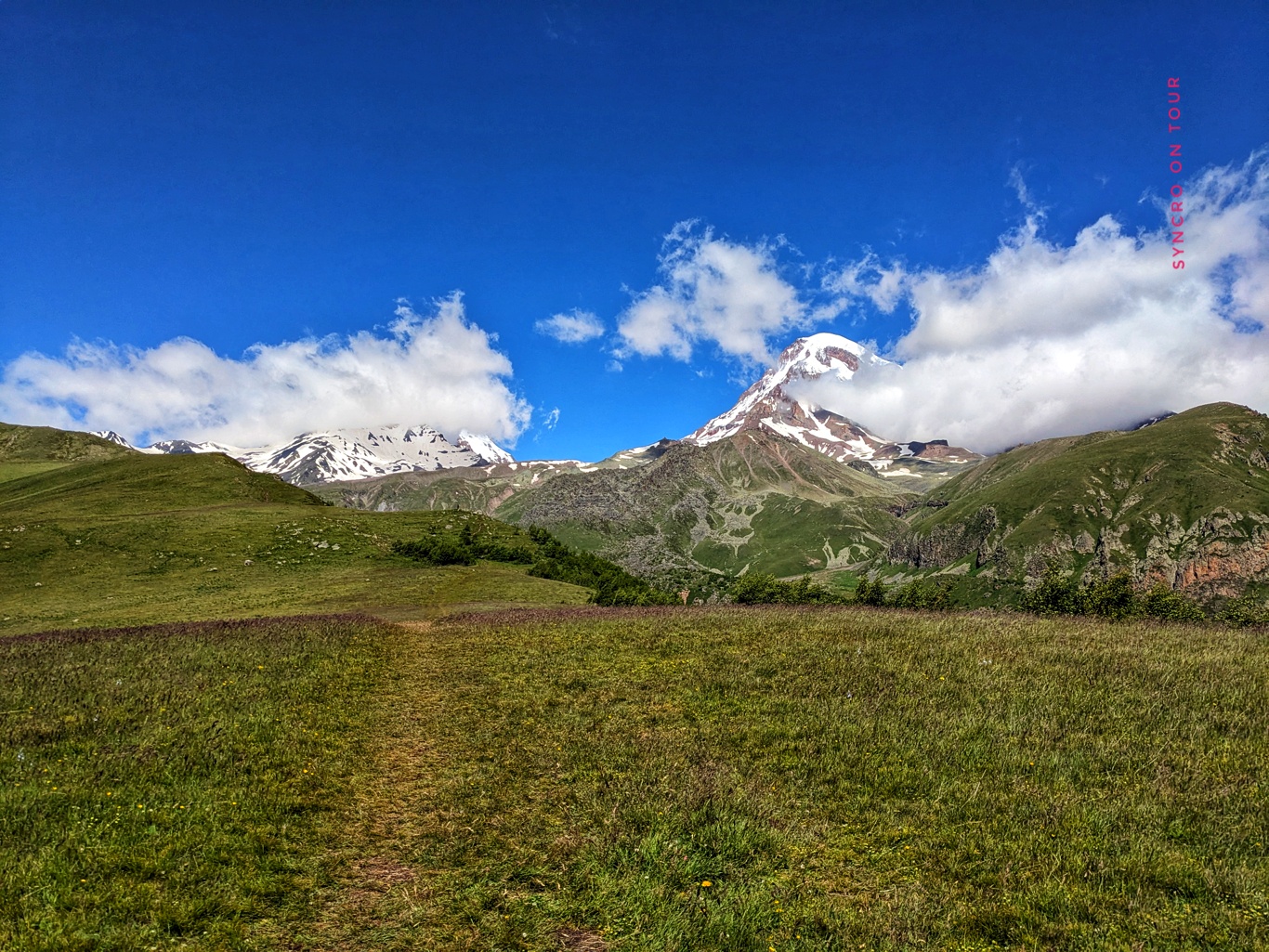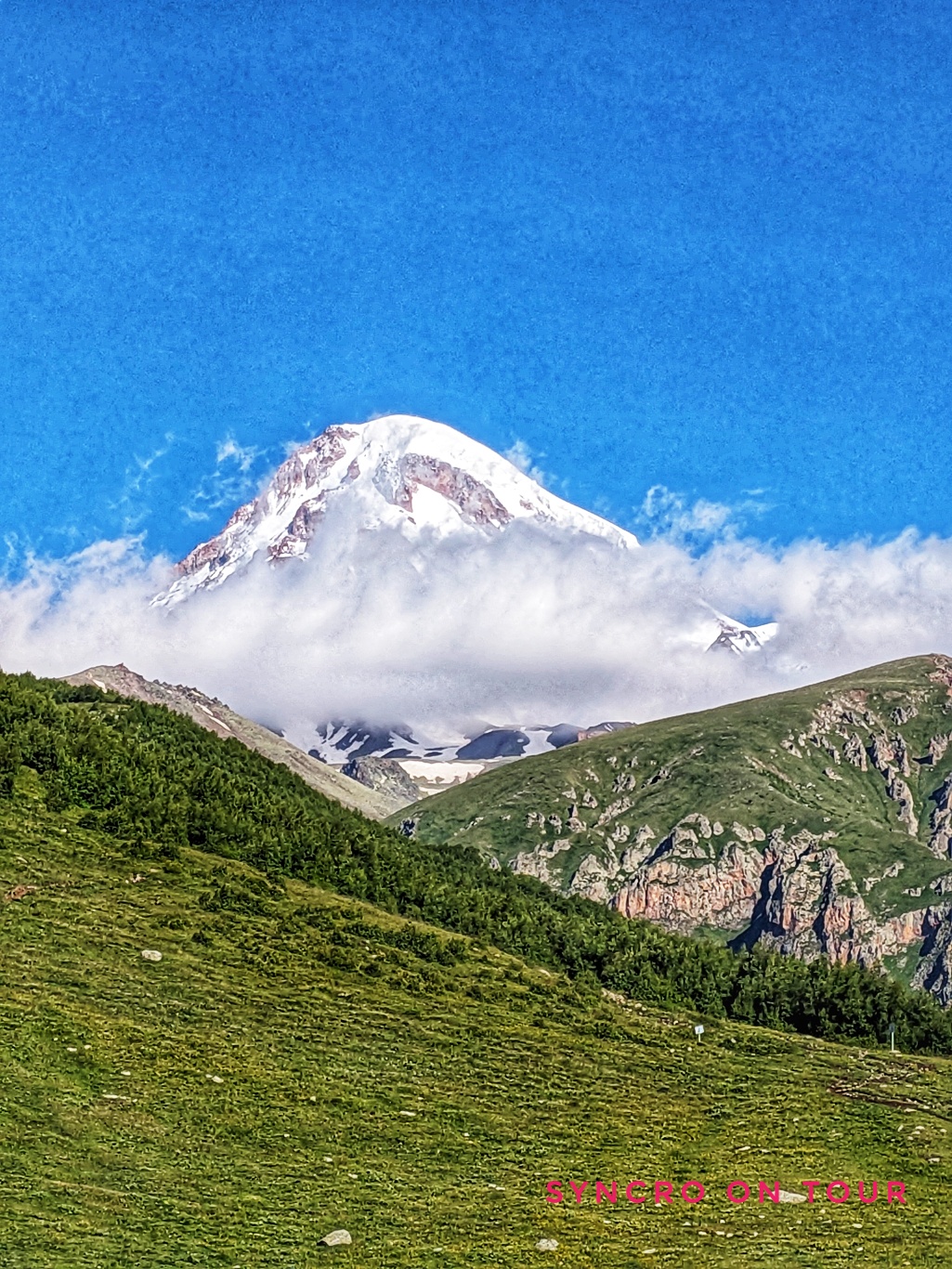 Dies ist der Blick zum Kazbek ganz früh am Morgen – noch vor dem Aufstehen. Schnell bilden sich wieder Wolken um die 5047 Meter hohe Spitze.