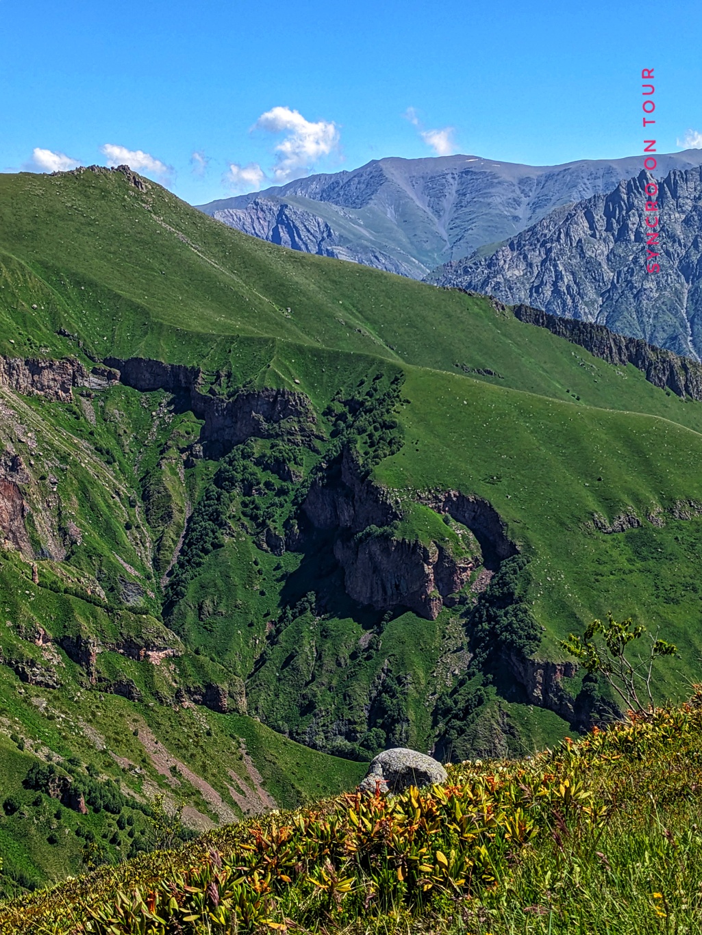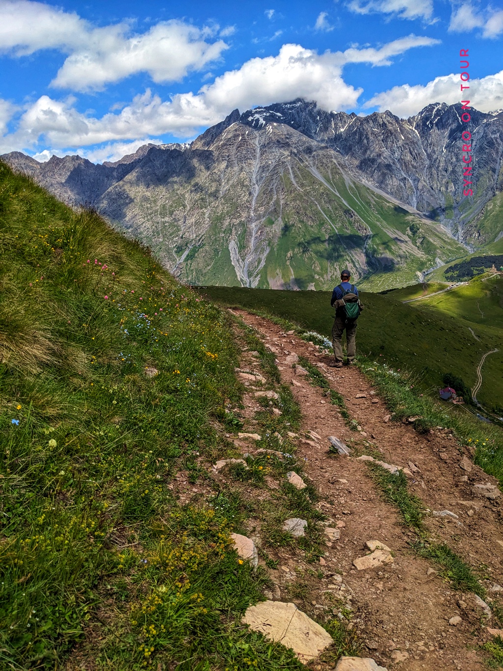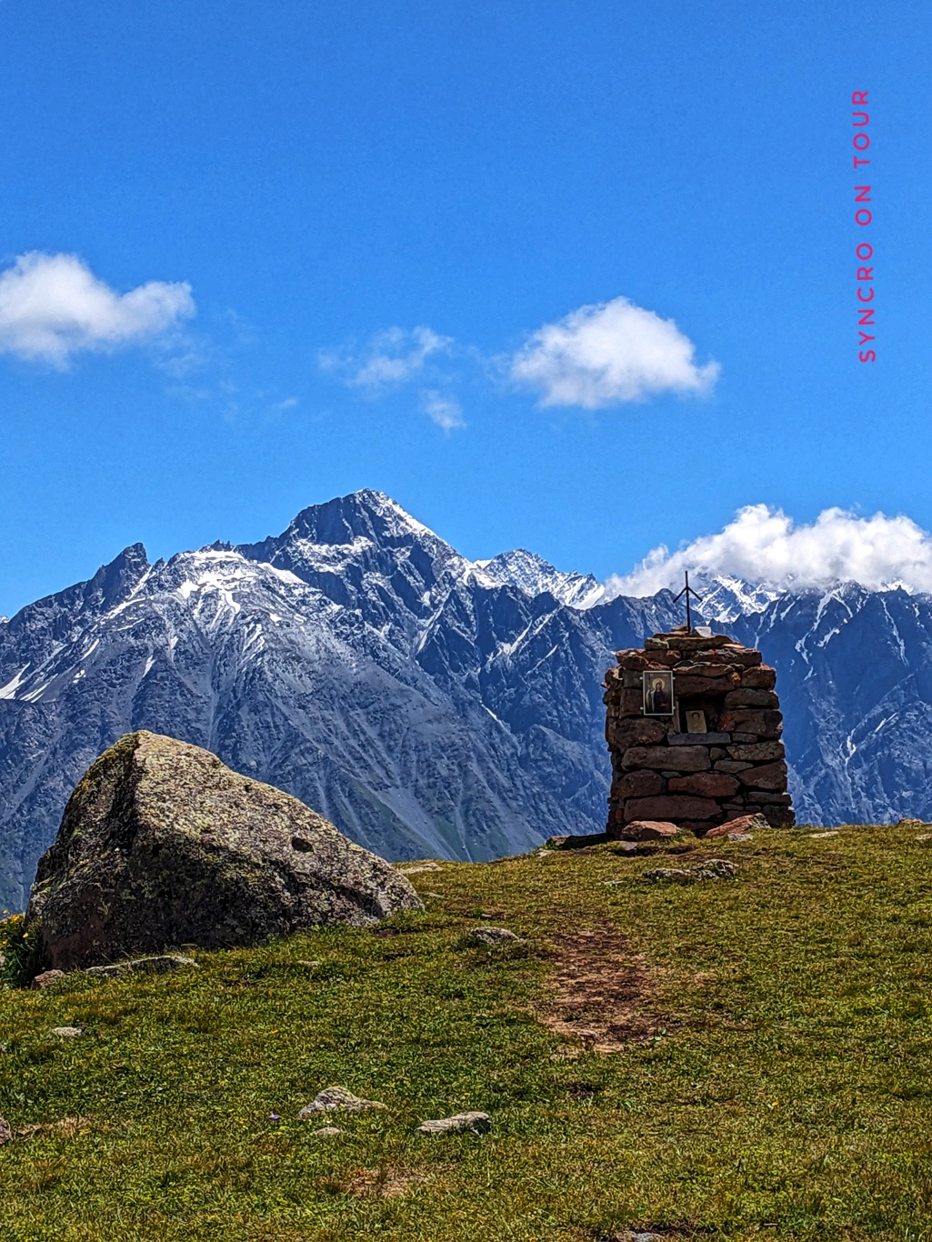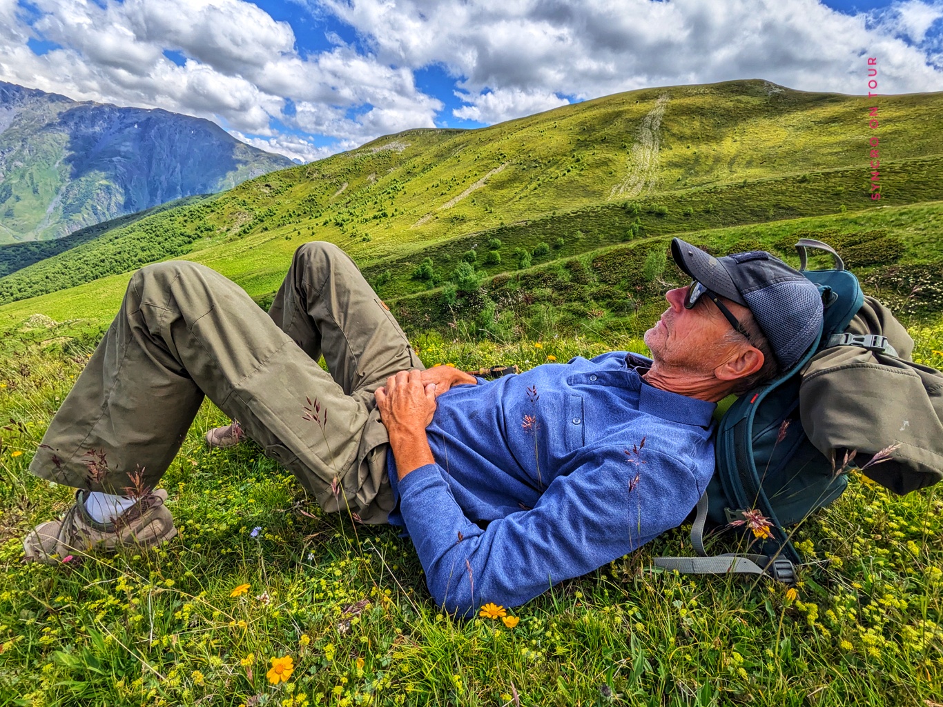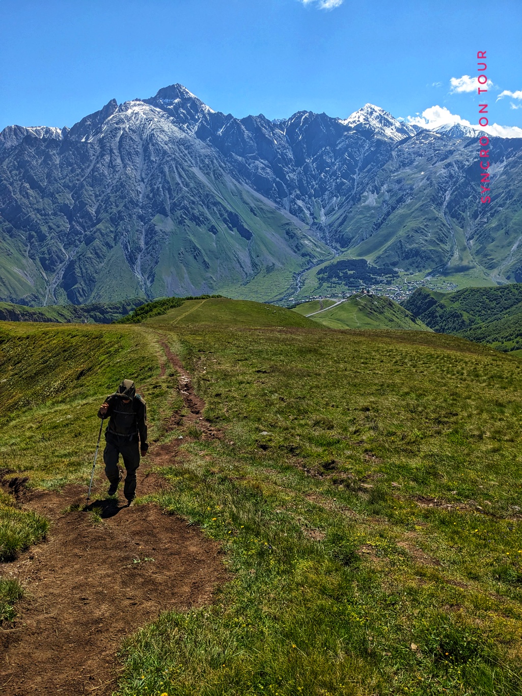 Wir haben heute eine für uns sehr anstrengende Bergtour immer über den Grat bis zum Arsha-Pass gemacht. Es ging immer bergan über schmale Pfade und immer mit Blick zum Kazbek, der sich immer mehr verhüllte. Es blies den ganzen Tag über ein sehr starker, kalter Wind, der uns sehr zusetzte, der aber auch dafür sorgte, dass der Himmel fast wolkenlos blieb.